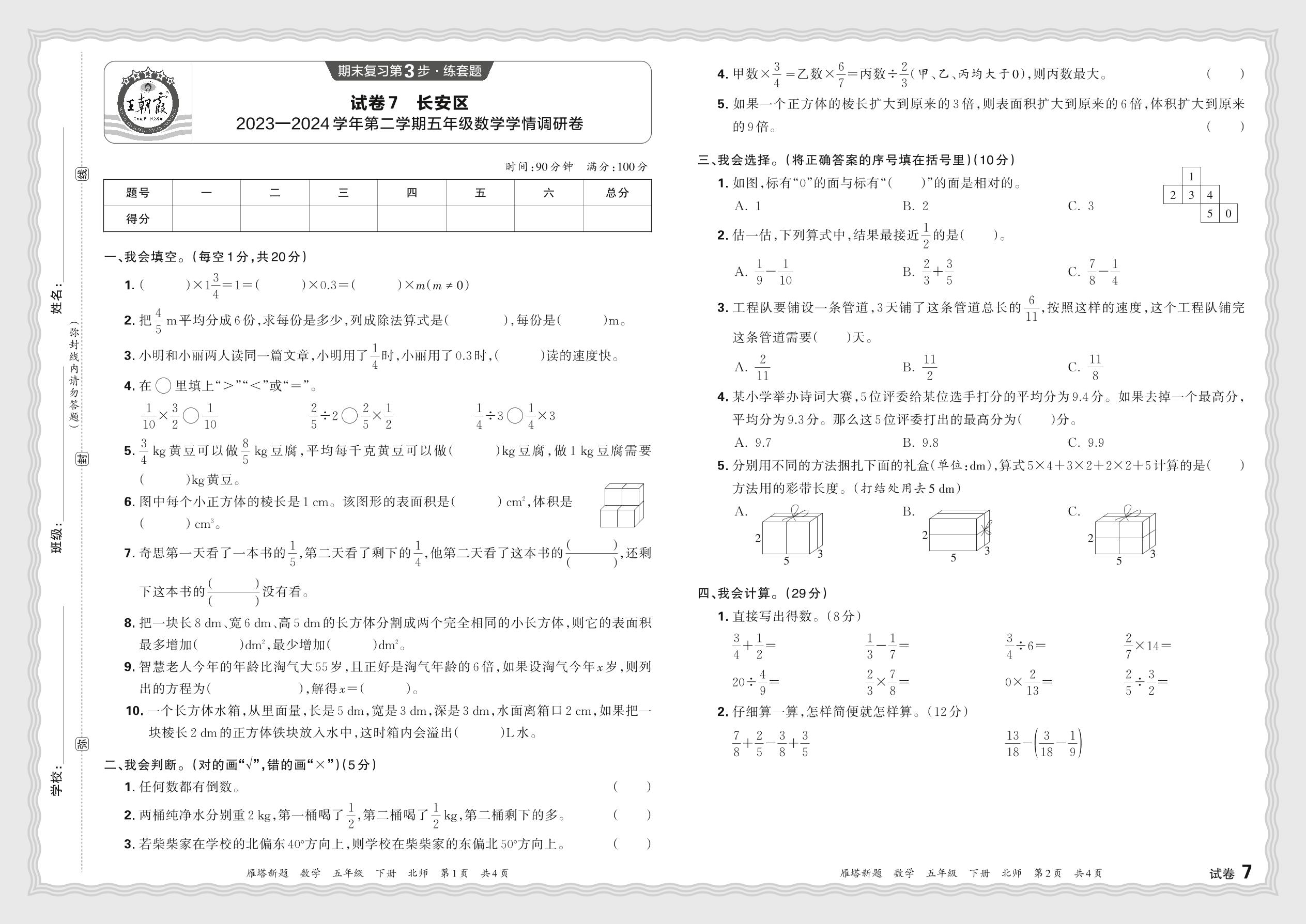 陕西省西安市长安区2023—2024学年第二学期五年级数学学情调研卷(北师版)【7】