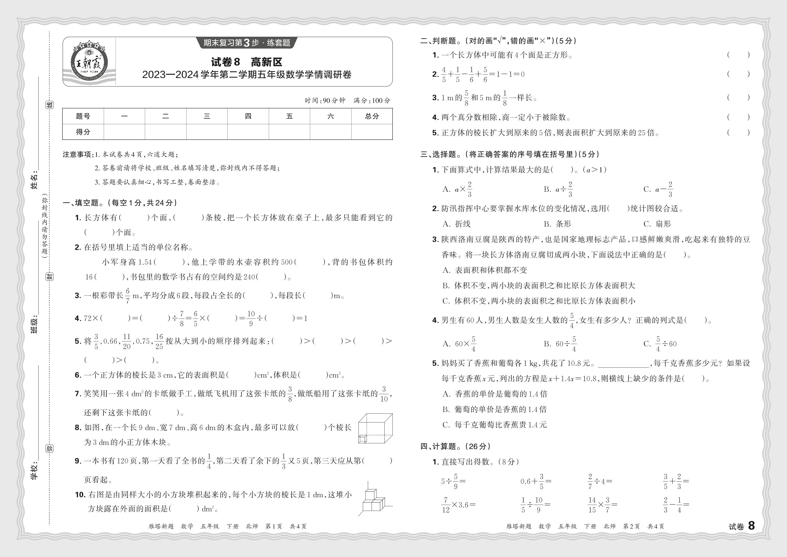 陕西省西安市高新区2023—2024学年第二学期五年级数学学情调研卷(北师版)【8】
