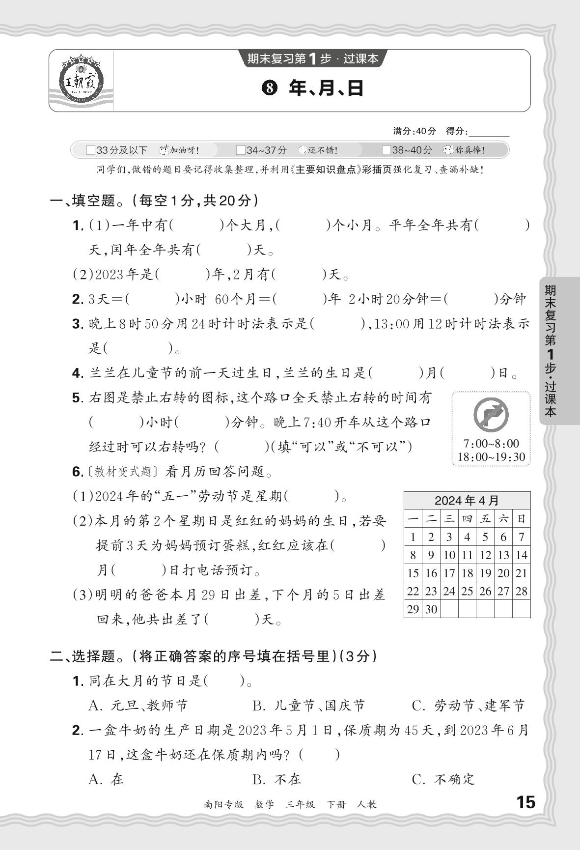 2024春下册三年级数学人教版 期末过课本南阳版·年、月、日【8】