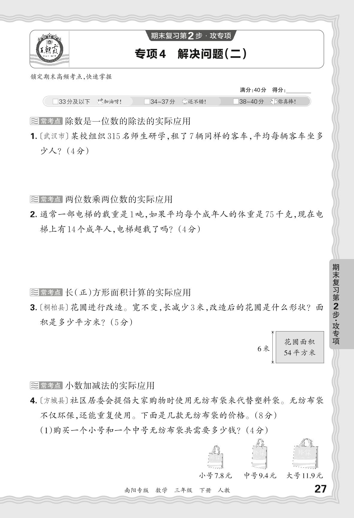2024春下册三年级数学人教版 期末专项卷南阳版·解决问题(二)【4】