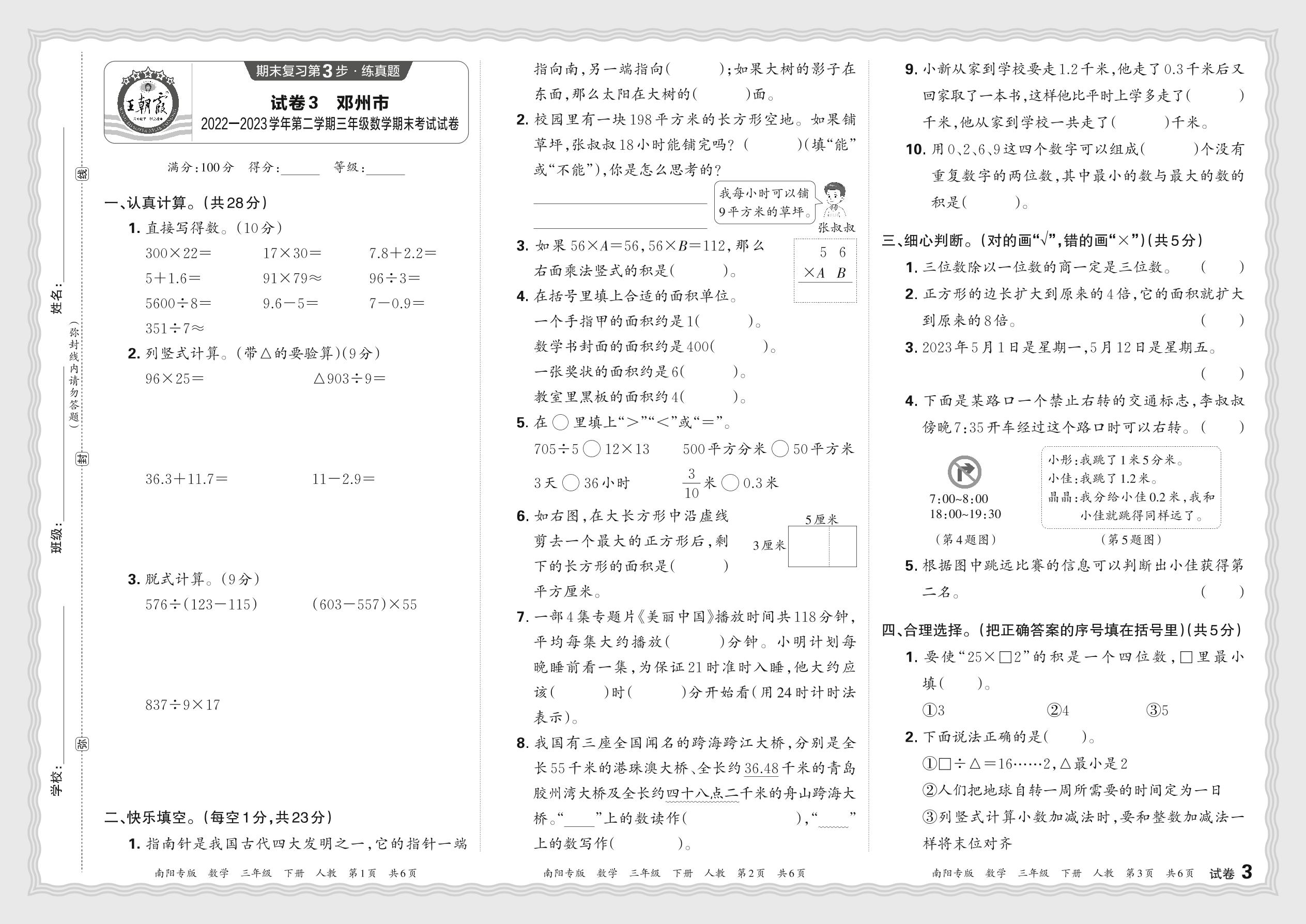 河南省南阳市邓州市2022-2023学年第二学期三年级数学期末考试试卷(人教版)【3】