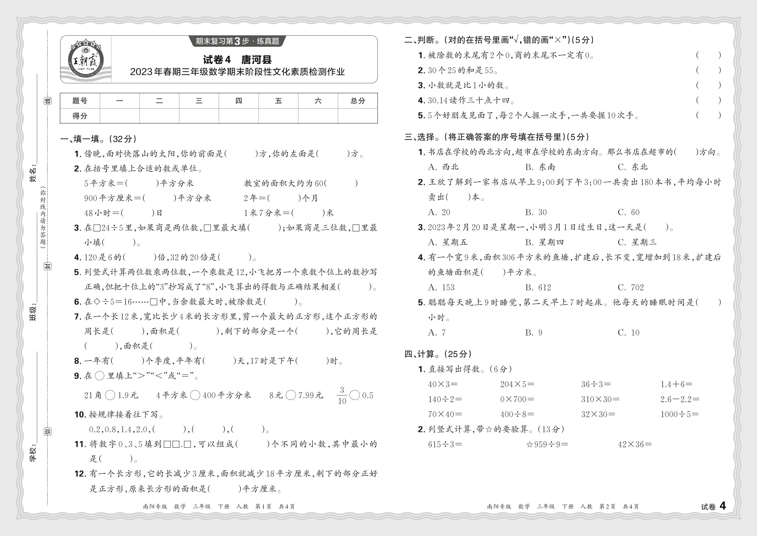 河南省南阳市唐河县2023年春期三年级数学期末阶段性文化素质检测作业(人教版)【4】