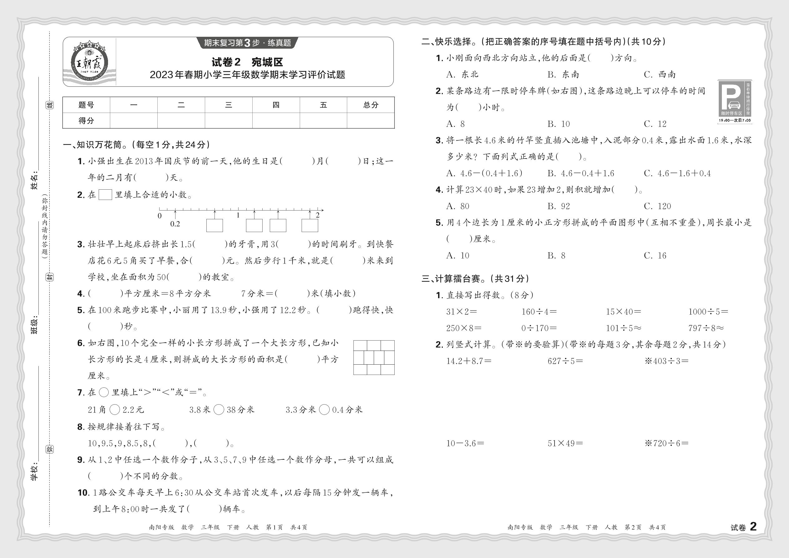河南省南阳市宛城区2023年春期小学三年级数学期末学习评价试题(人教版)【2】