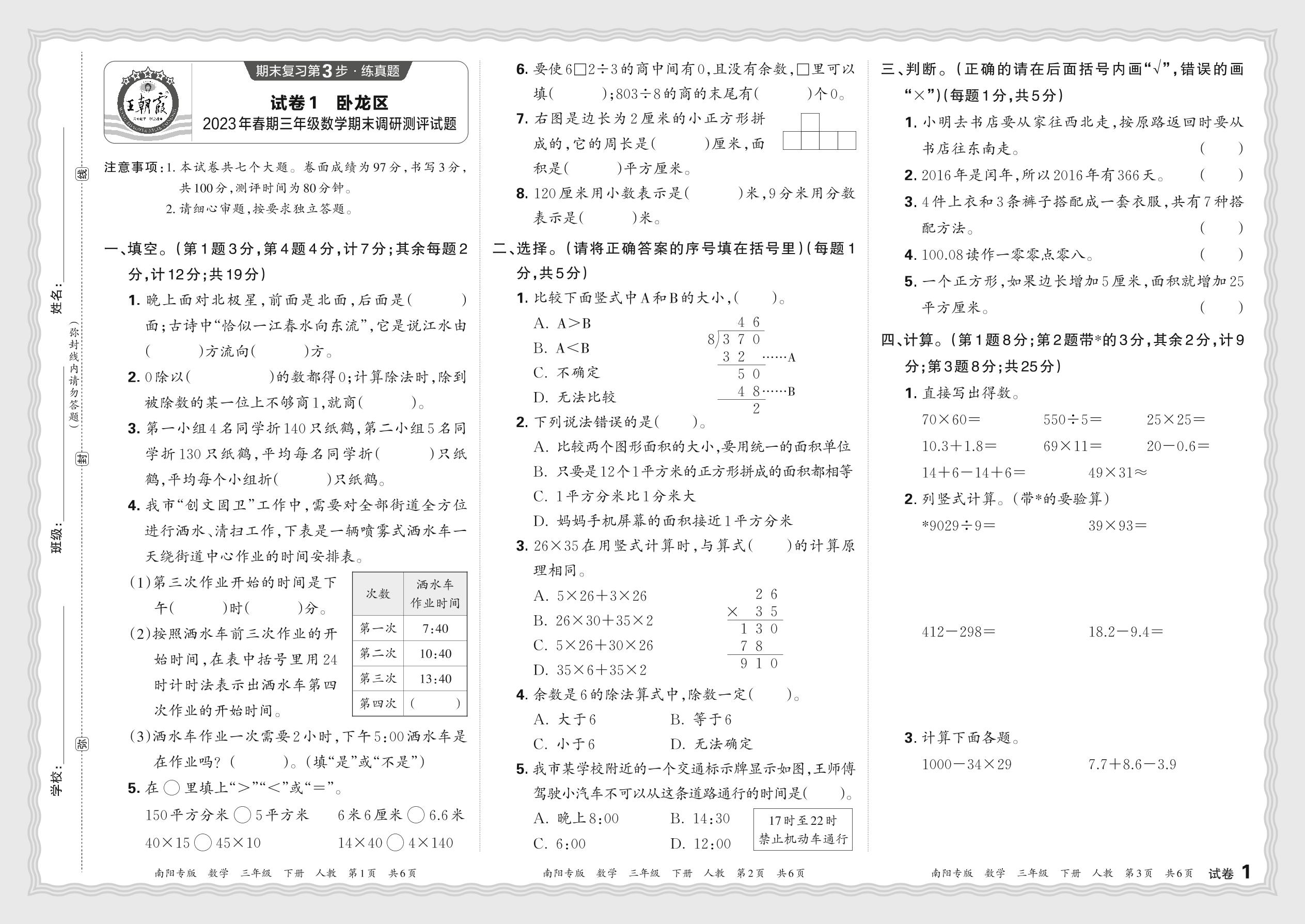 河南省南阳市卧龙区2023年春期三年级数学期末调研测评试题(人教版)【1】