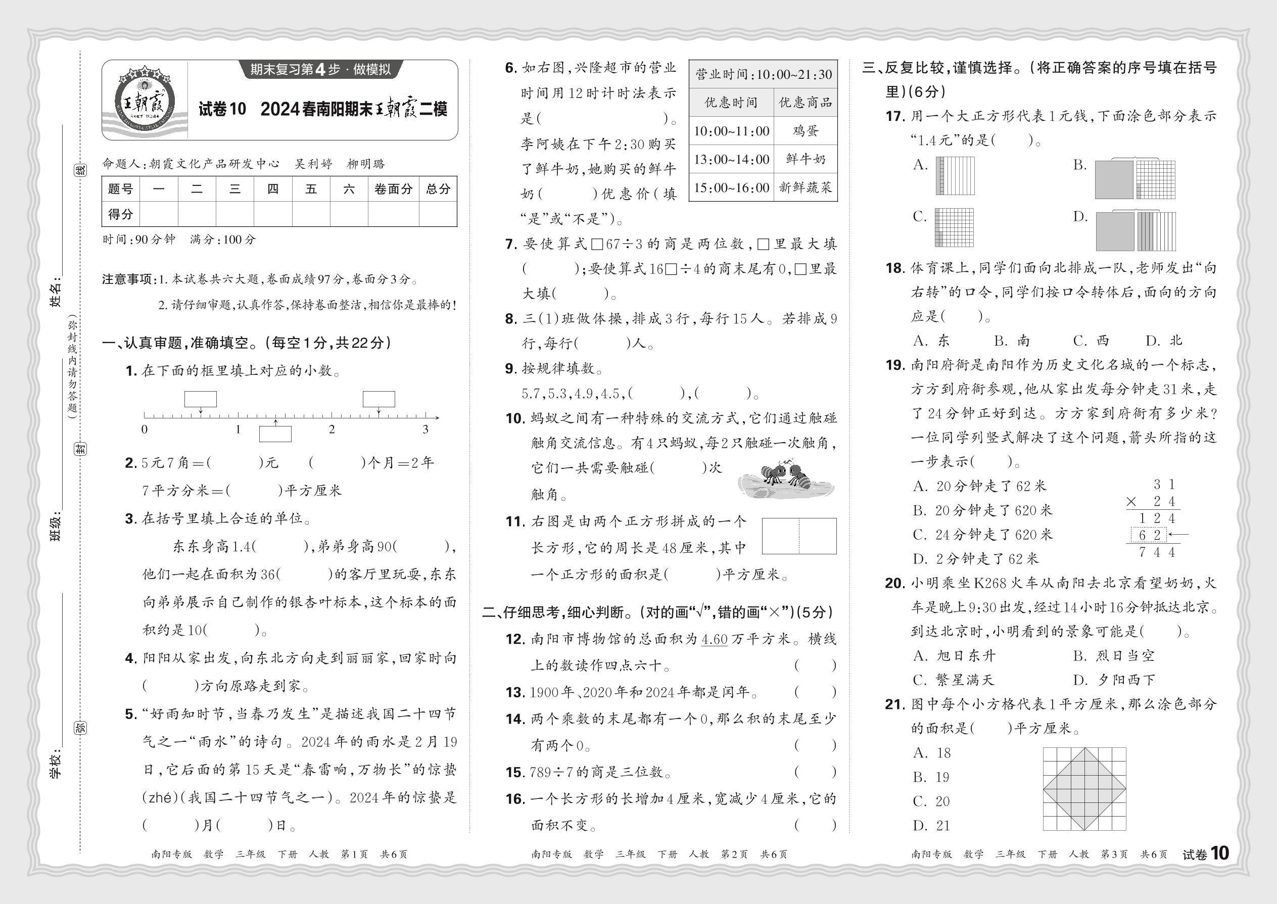 2024春下册三年级数学人教版 河南南阳期末王朝霞二模【10】