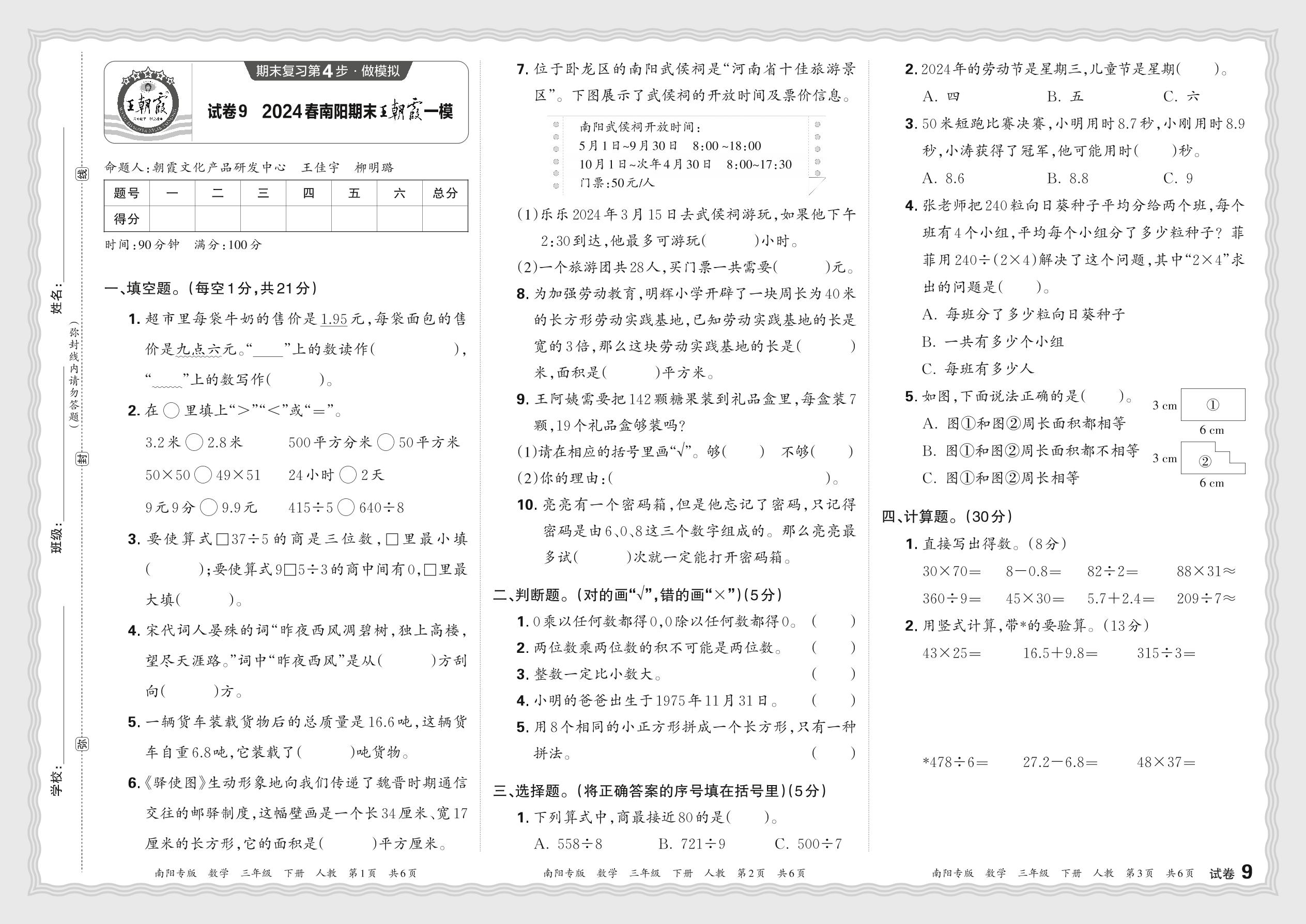 2024春下册三年级数学人教版 河南南阳期末王朝霞一模【9】