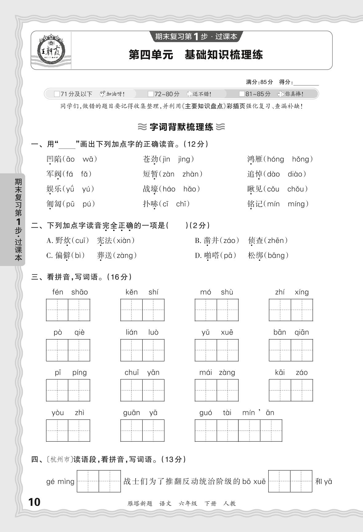 2024春下册六年级语文人教版 期末过课本西安版·第四单元 基础知识梳理练