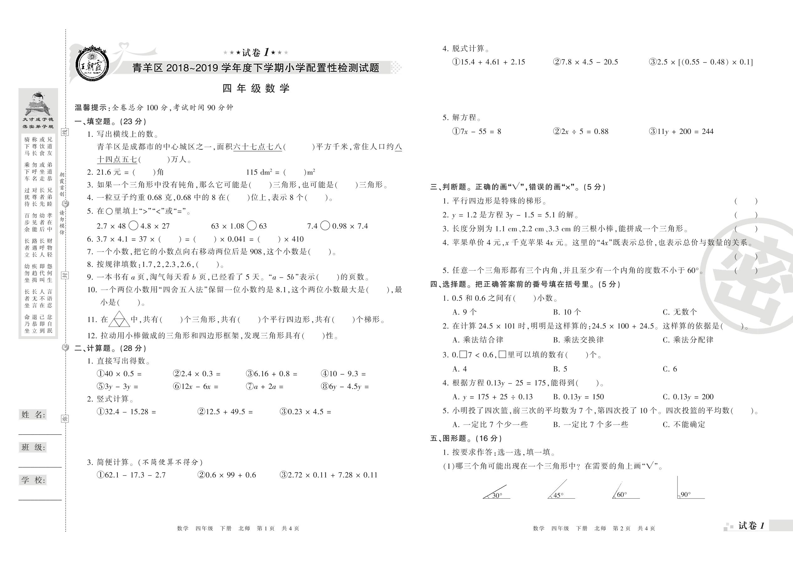 2018-2019学年第二学期成都市青羊区四年级数学试卷(北师版)【1】