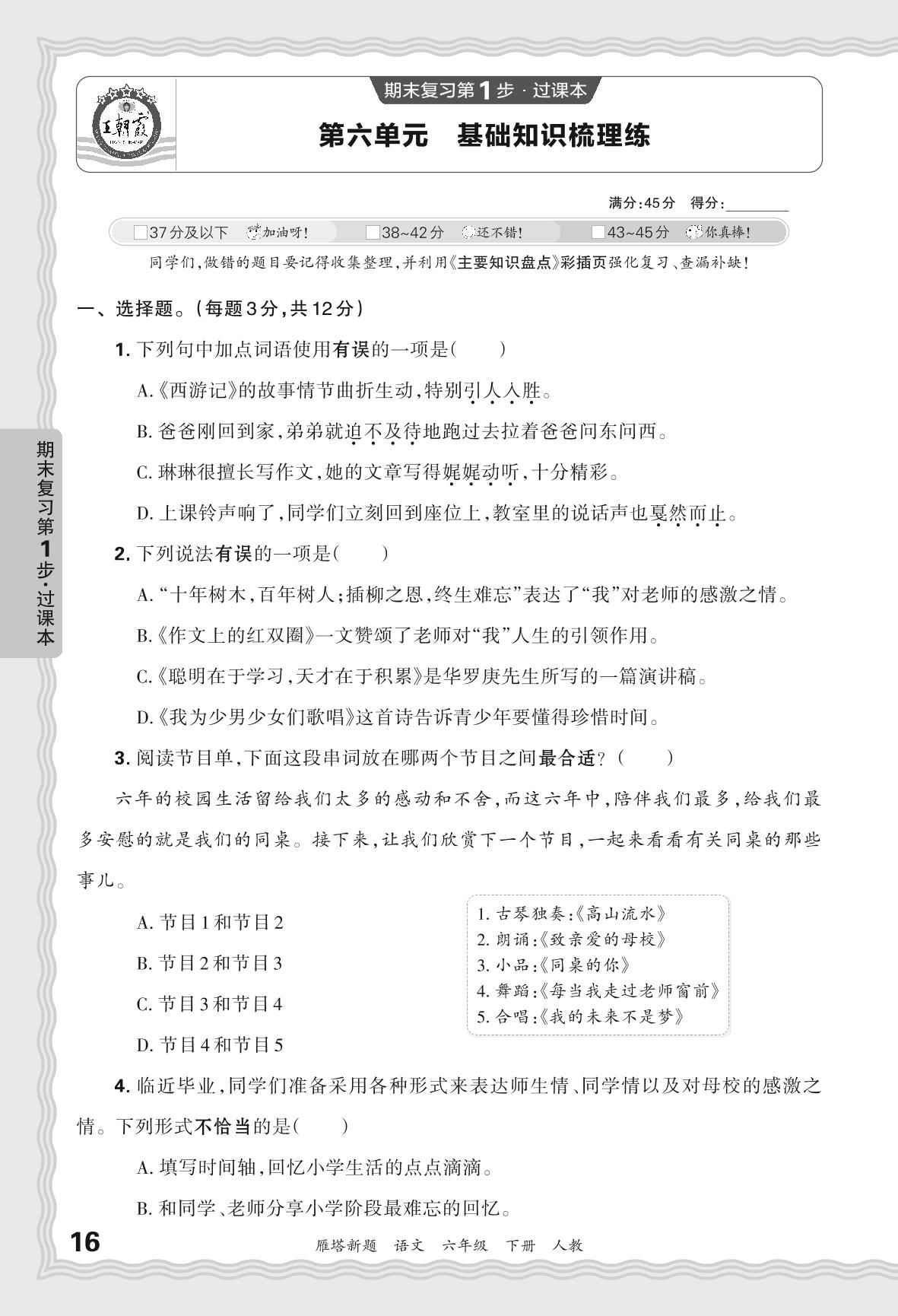 2024春下册六年级语文人教版 期末过课本西安版·第六单元 基础知识梳理练