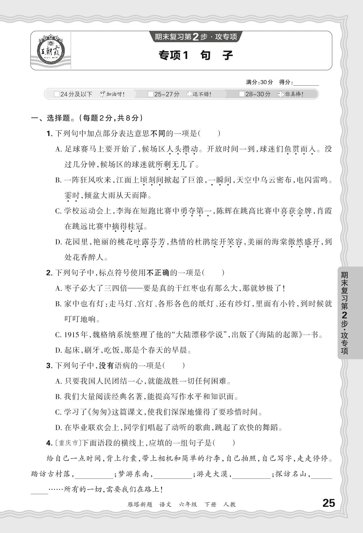 2024春下册六年级语文人教版 期末专项卷西安版·句子【1】