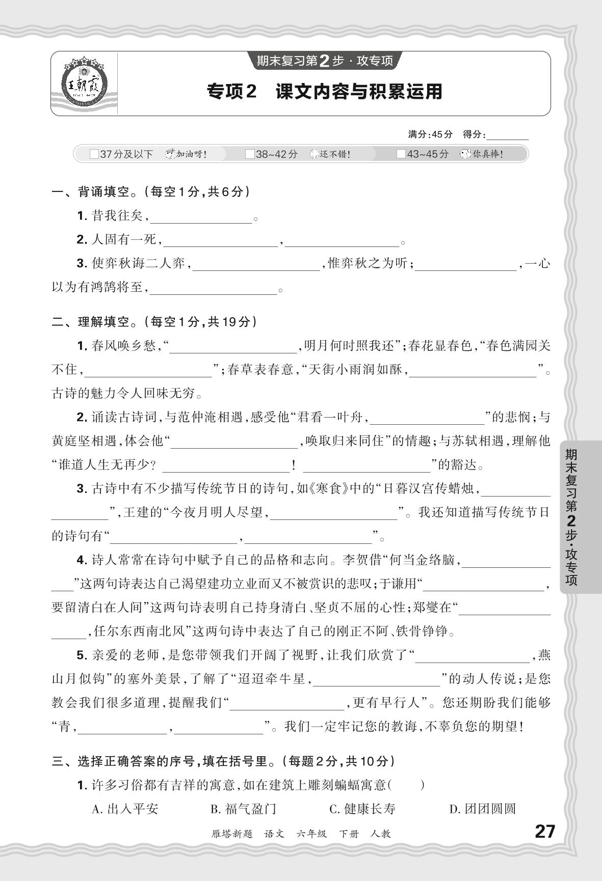 2024春下册六年级语文人教版 期末专项卷西安版·课文内容与积累运用【2】