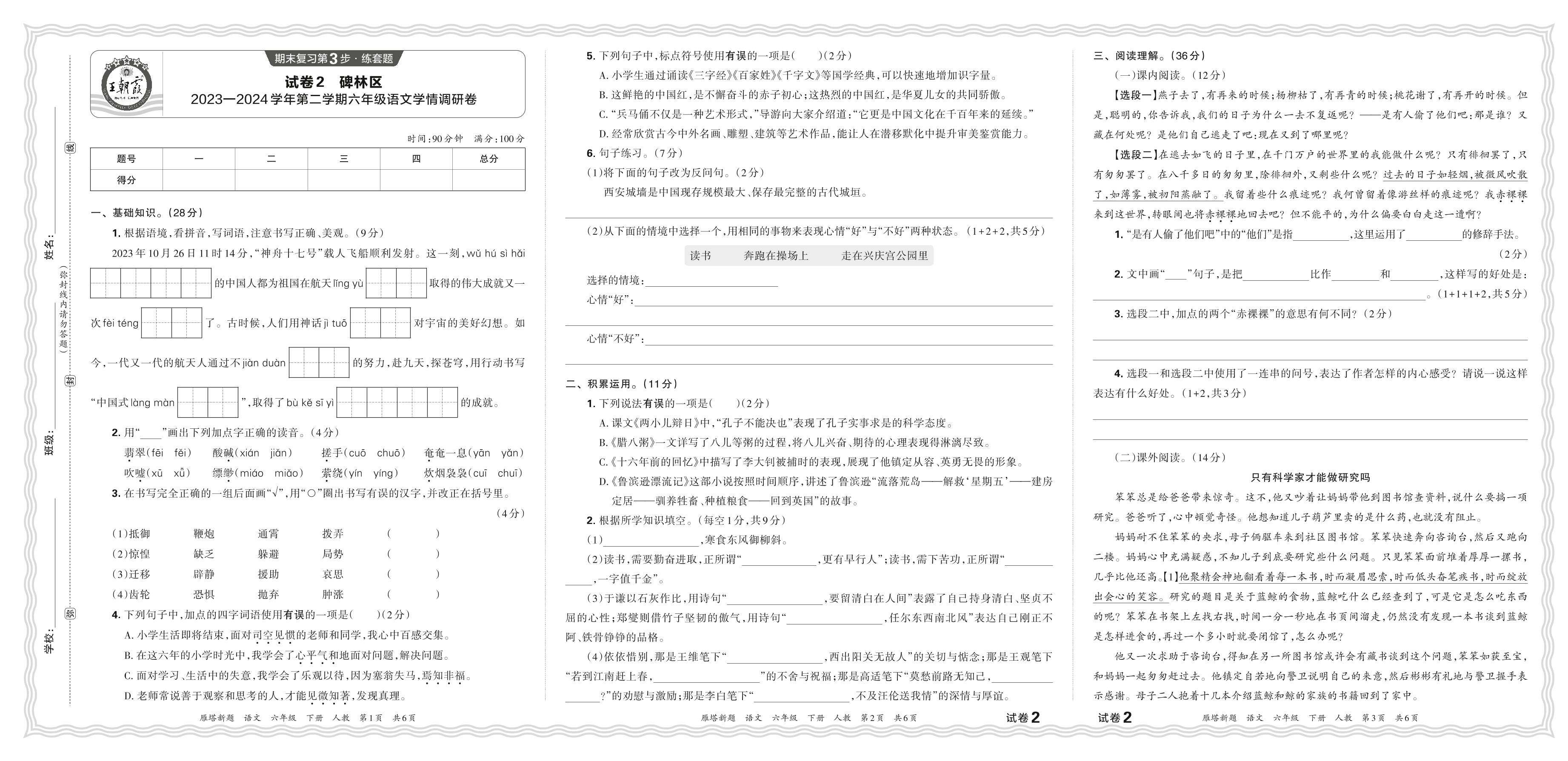 陕西省西安市碑林区2023—2024学年第二学期六年级语文学情调研卷(人教版)【2】