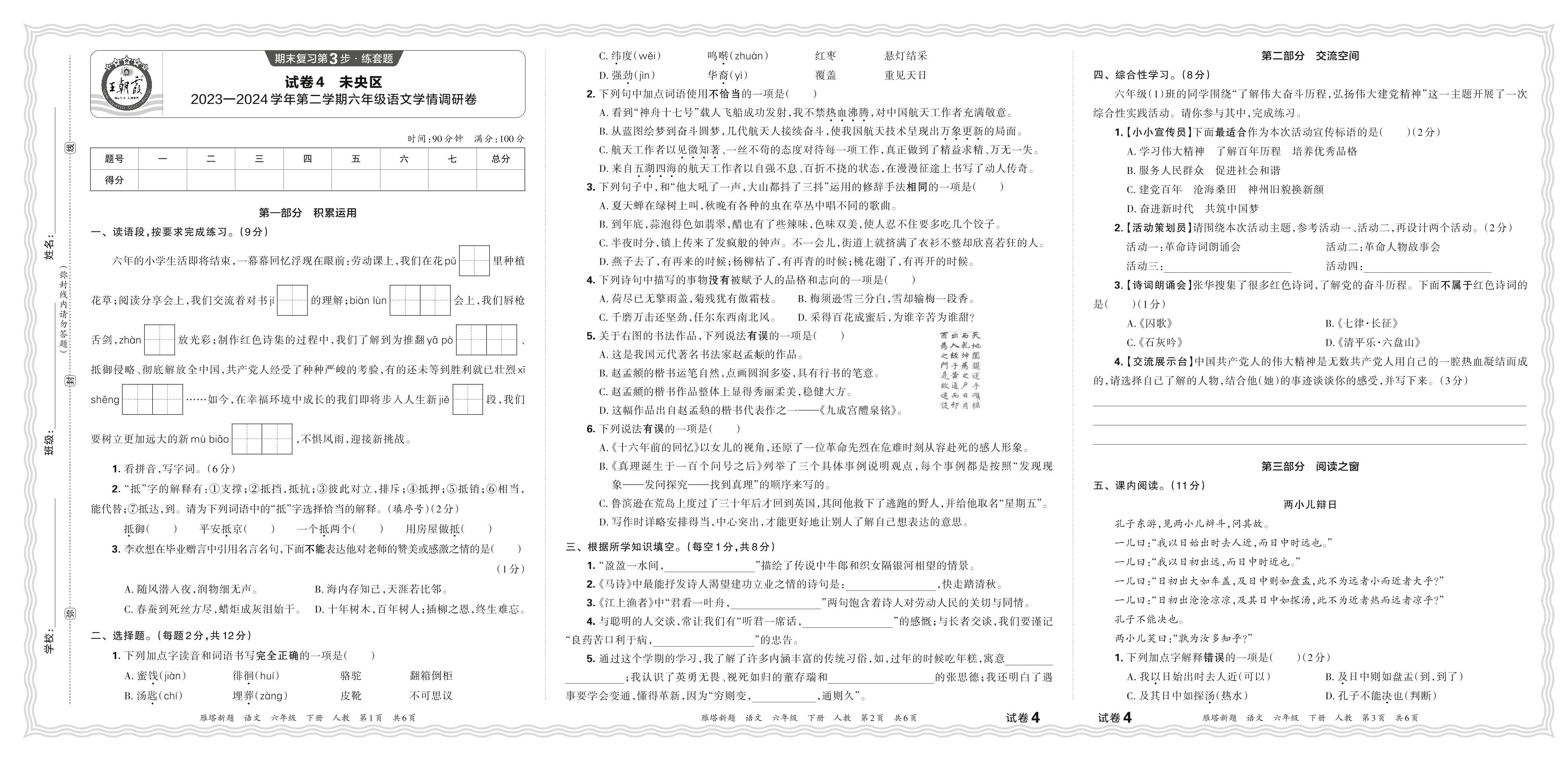 陕西省西安市未央区2023—2024学年第二学期六年级语文学情调研卷(人教版)【4】