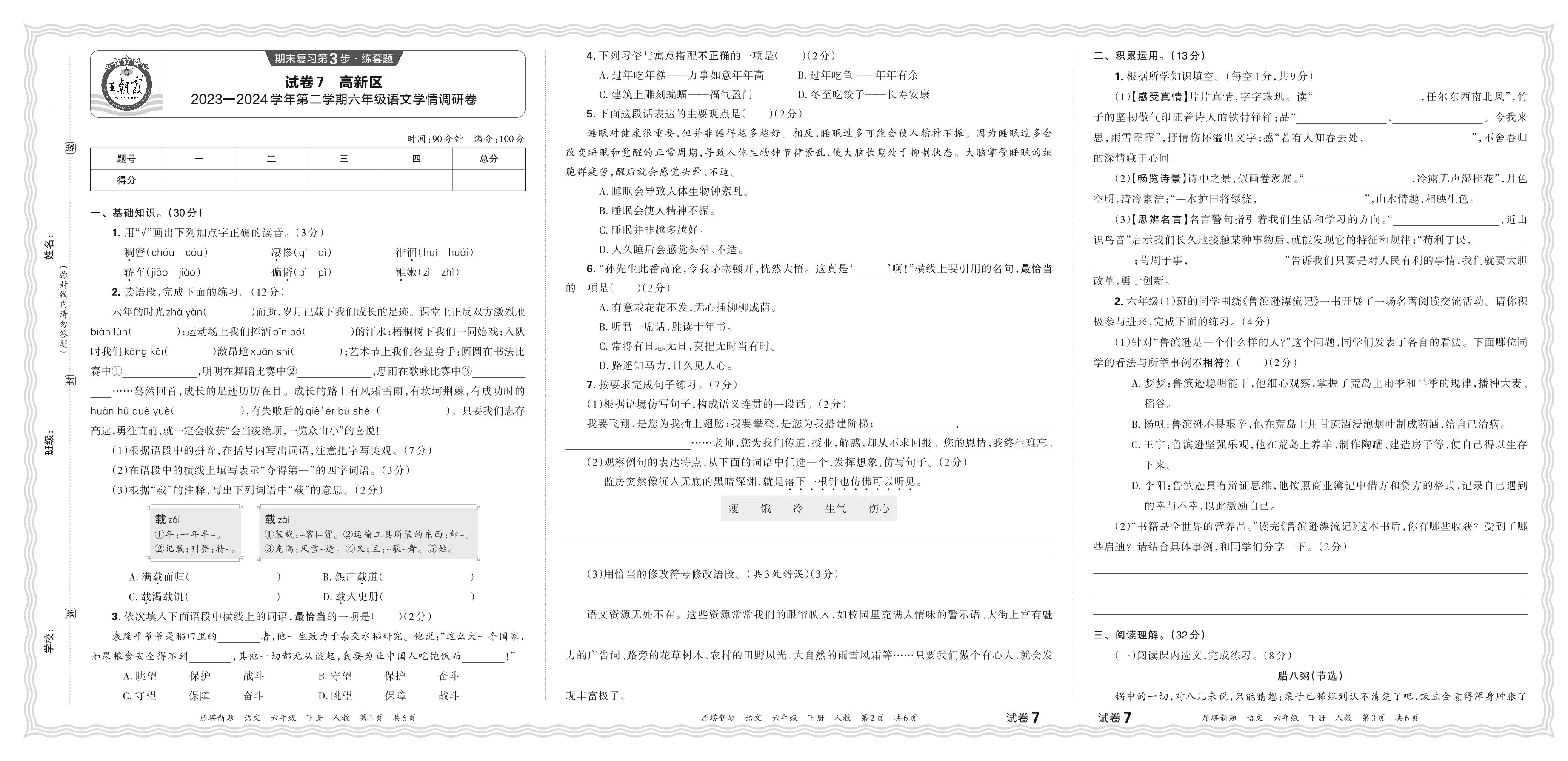 陕西省西安市高新区2023—2024学年第二学期六年级语文学情调研卷(人教版)【7】