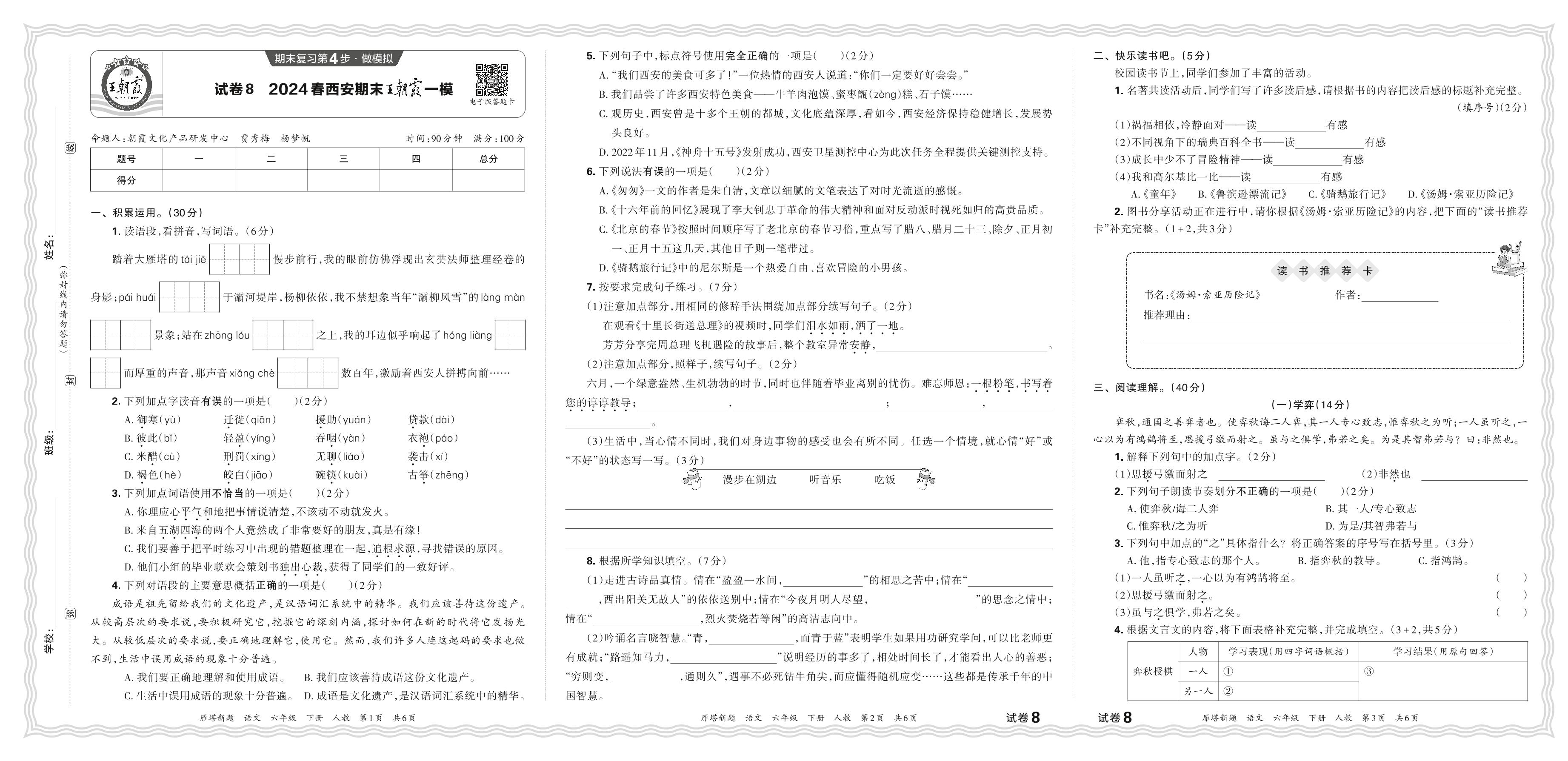 2024春下册六年级语文人教版 陕西西安期末王朝霞一模