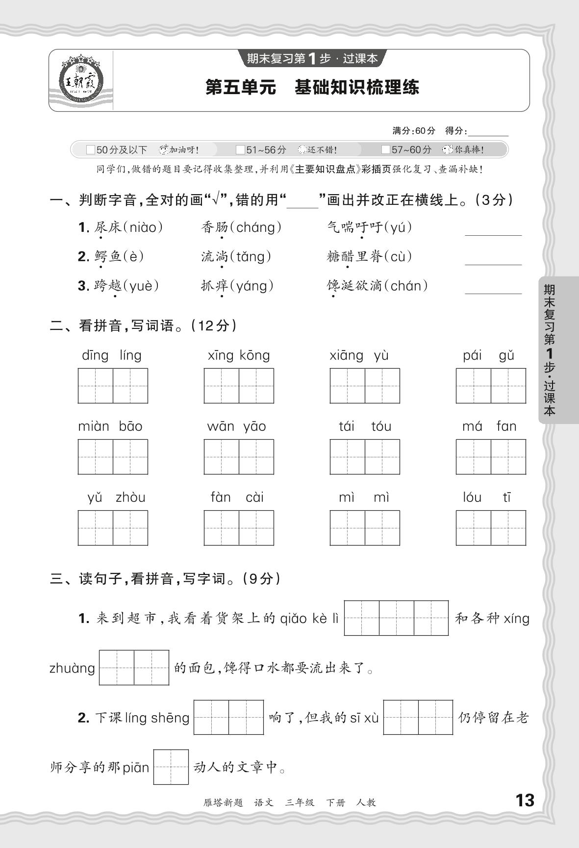2024春下册三年级语文人教版 期末过课本西安版·第五单元 基础知识梳理练