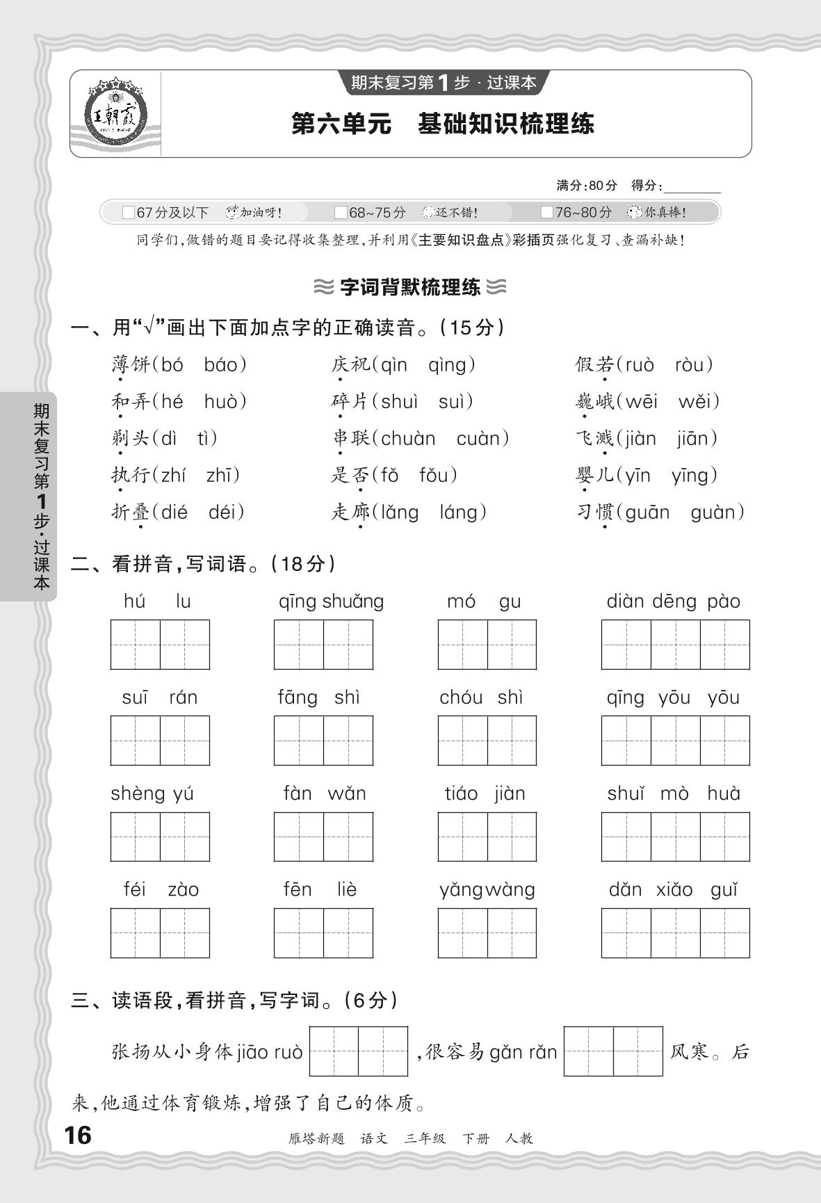 2024春下册三年级语文人教版 期末过课本西安版·第六单元 基础知识梳理练