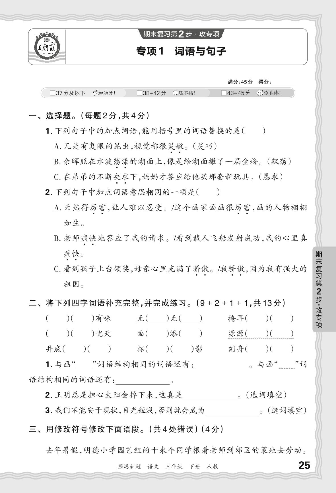 2024春下册三年级语文人教版 期末专项卷西安版·词语与句子【1】