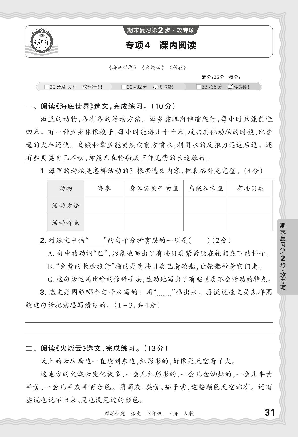 2024春下册三年级语文人教版 期末专项卷西安版·课内阅读【4】