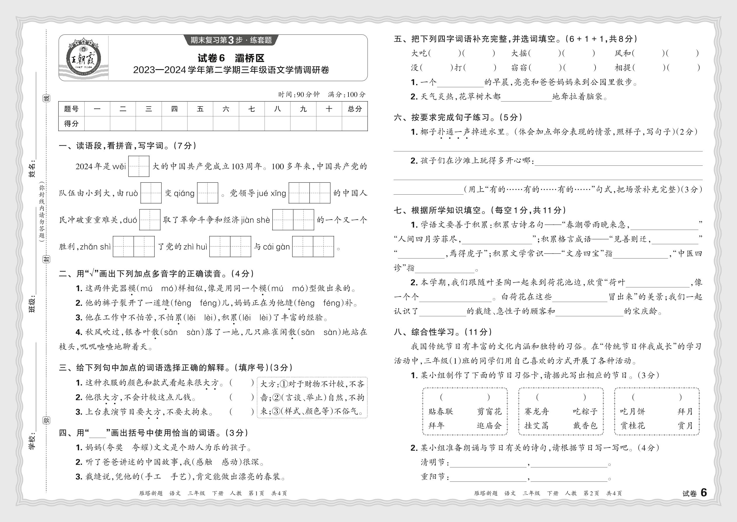 陕西省西安市灞桥区2023—2024学年第二学期三年级语文学情调研卷(人教版)【6】