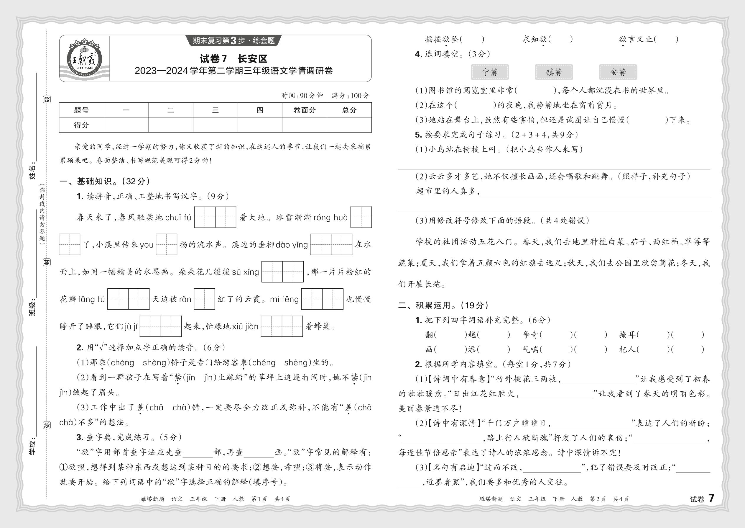 陕西省西安市长安区2023—2024学年第二学期三年级语文学情调研卷(人教版)【7】