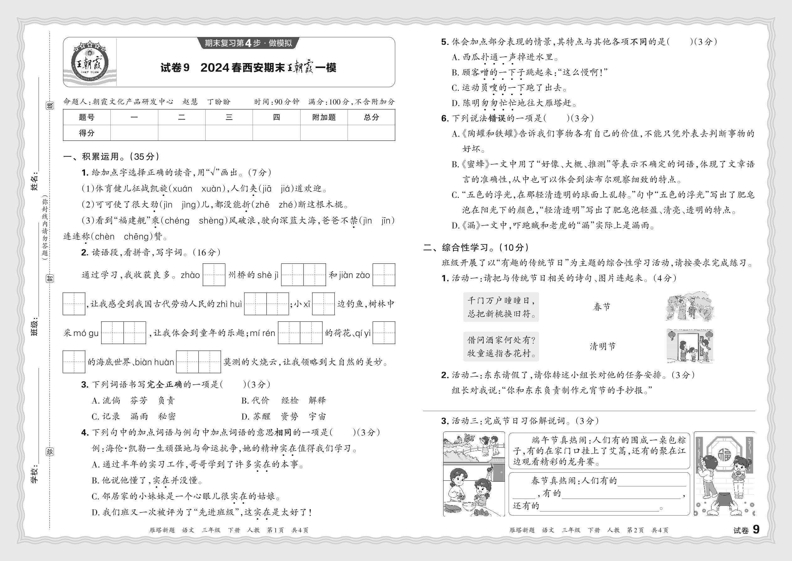 2024春下册三年级语文人教版 陕西西安期末王朝霞一模