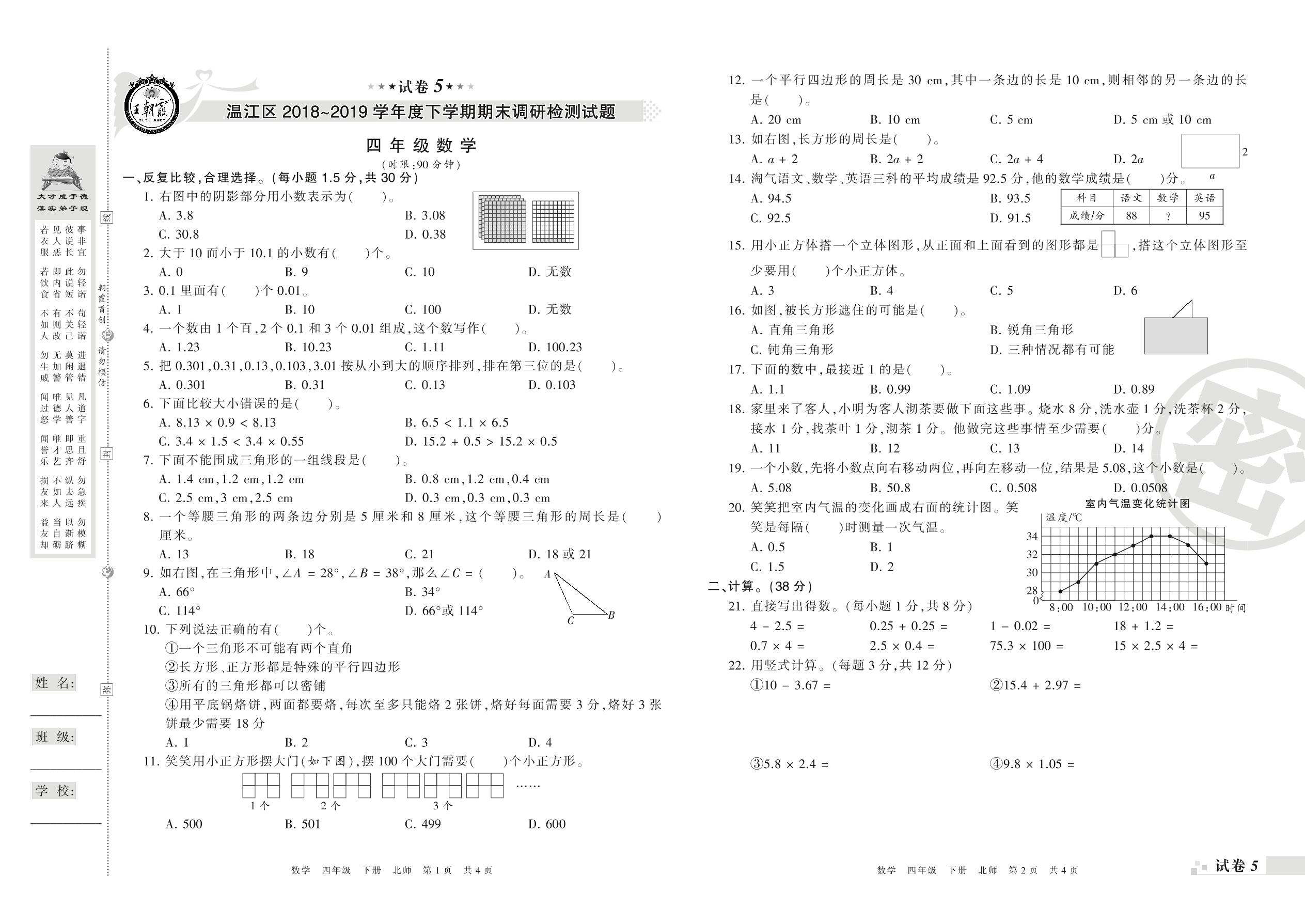 2018-2019学年第二学期成都市温江区四年级数学试卷(北师版)【5】