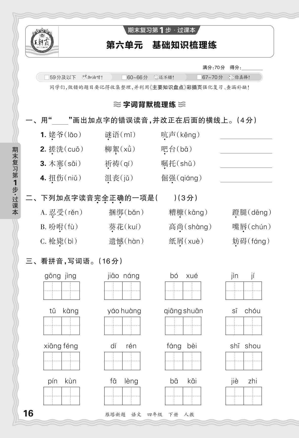 2024春下册四年级语文人教版 期末过课本西安版·第六单元 基础知识梳理练