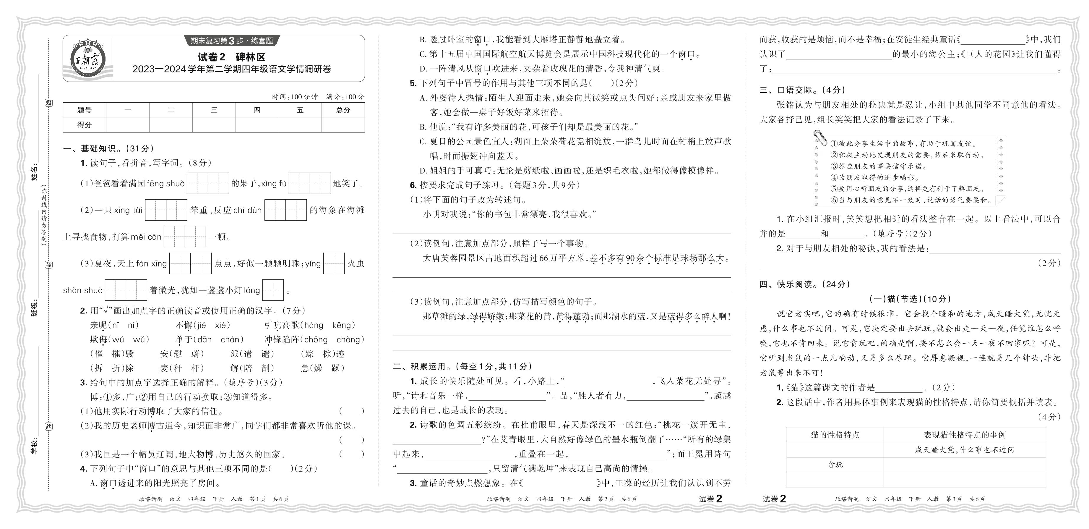 陕西省西安市碑林区2023—2024学年第二学期四年级语文学情调研卷(人教版)【2】
