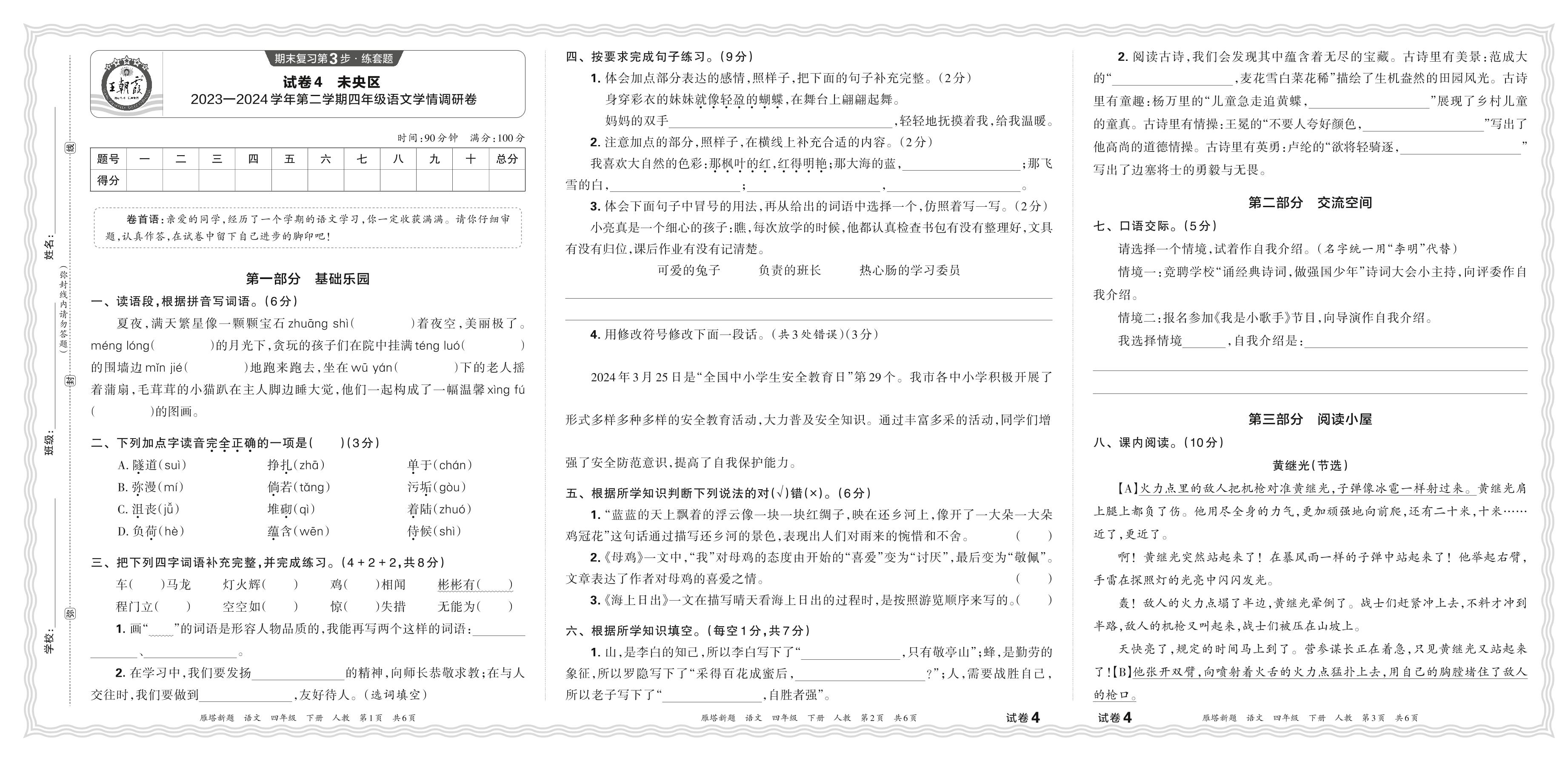 四年级语文人教版下册期末卷