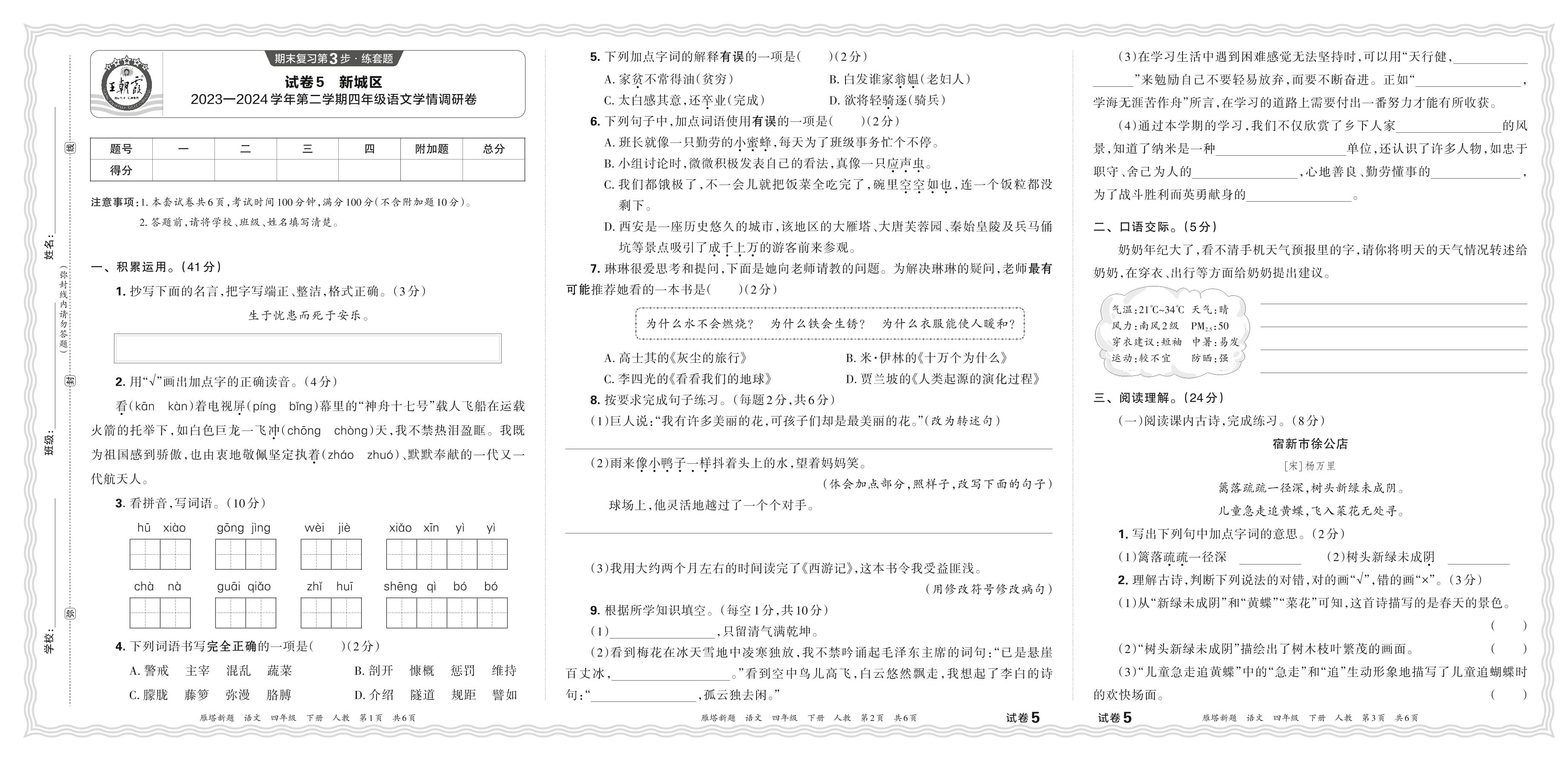 陕西省西安市新城区2023—2024学年第二学期四年级语文学情调研卷(人教版)【5】