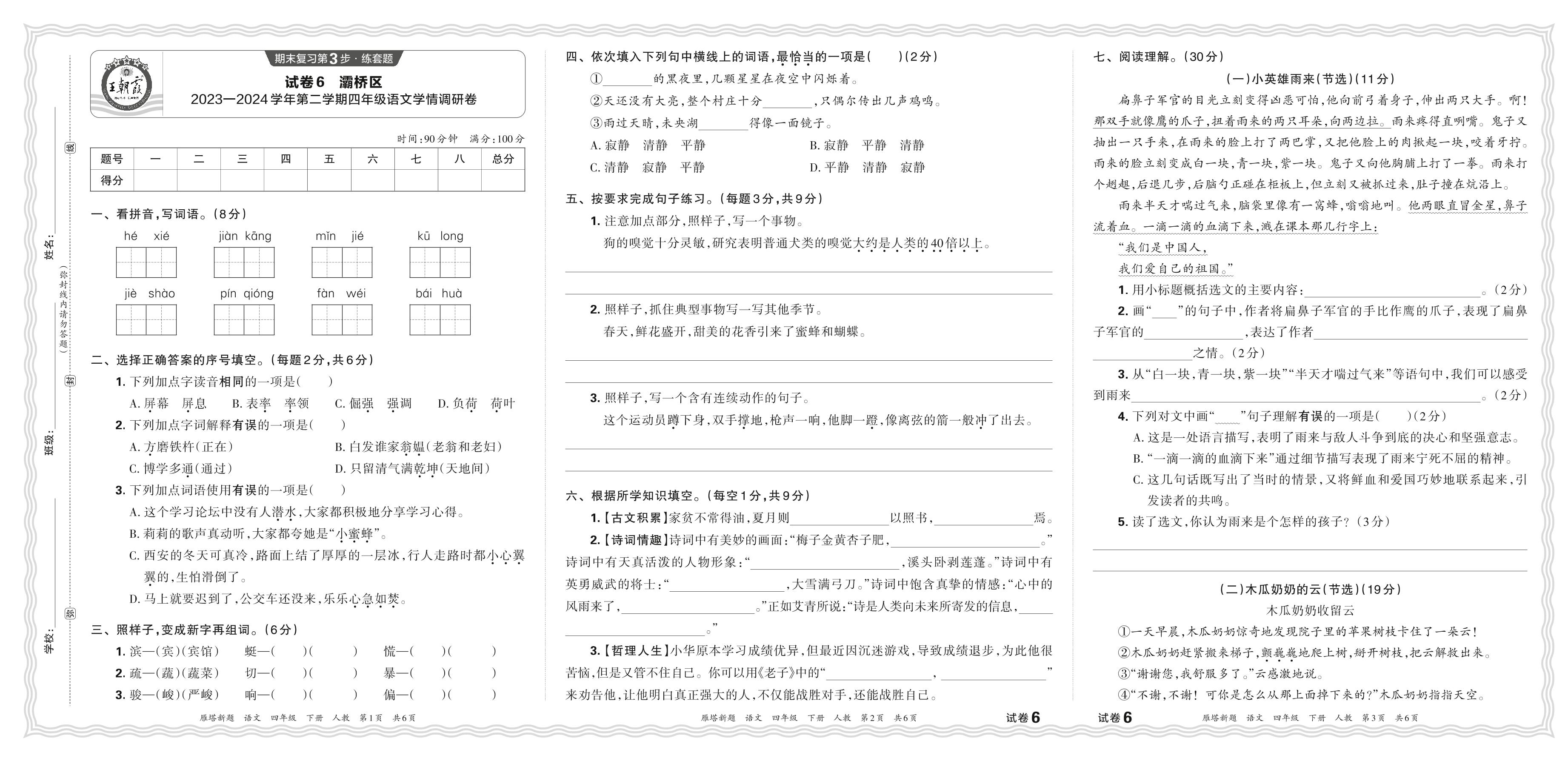 陕西省西安市灞桥区2023—2024学年第二学期四年级语文学情调研卷(人教版)【6】