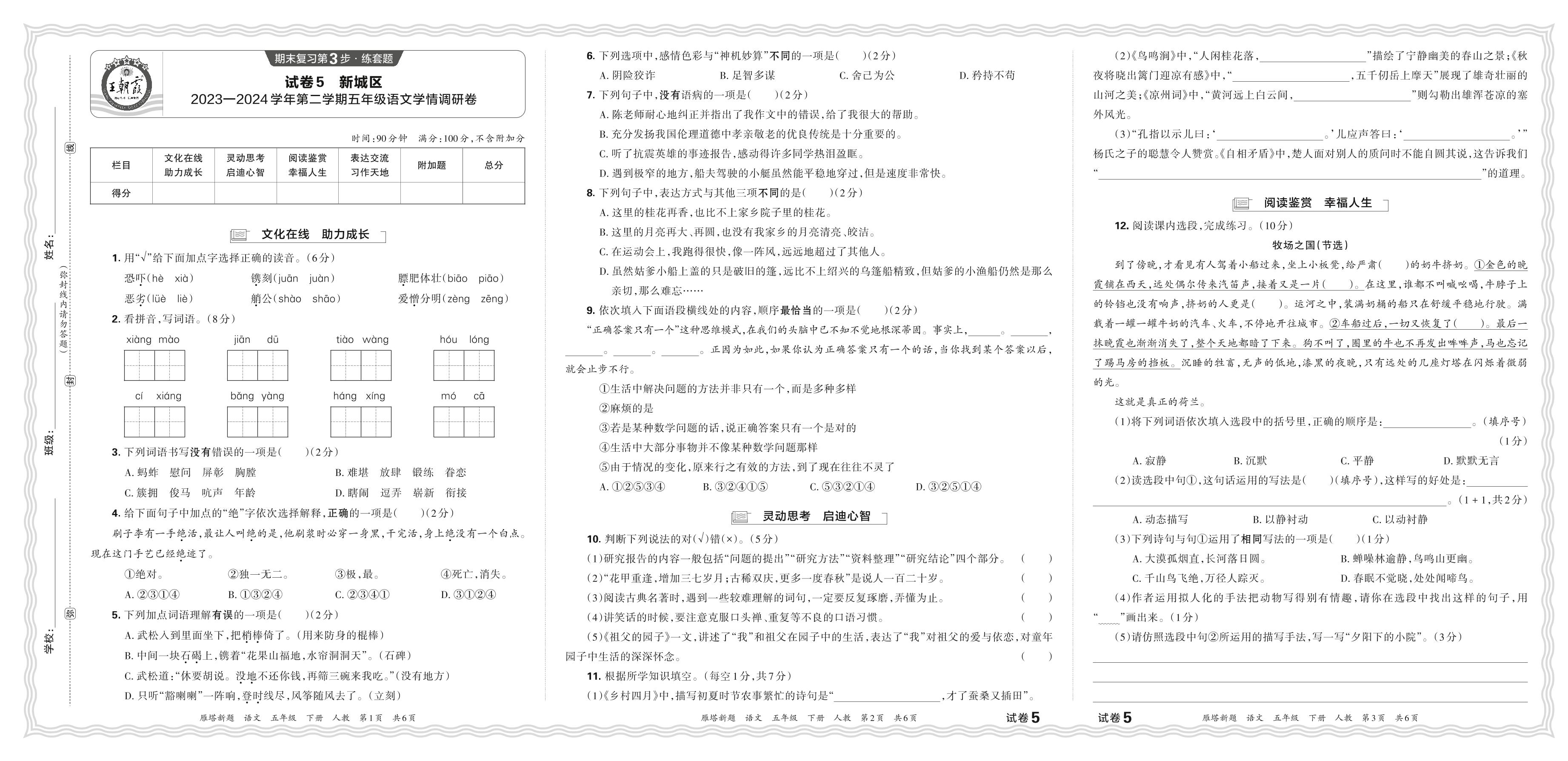 陕西省西安市新城区2023—2024学年第二学期五年级语文学情调研卷(人教版)【5】
