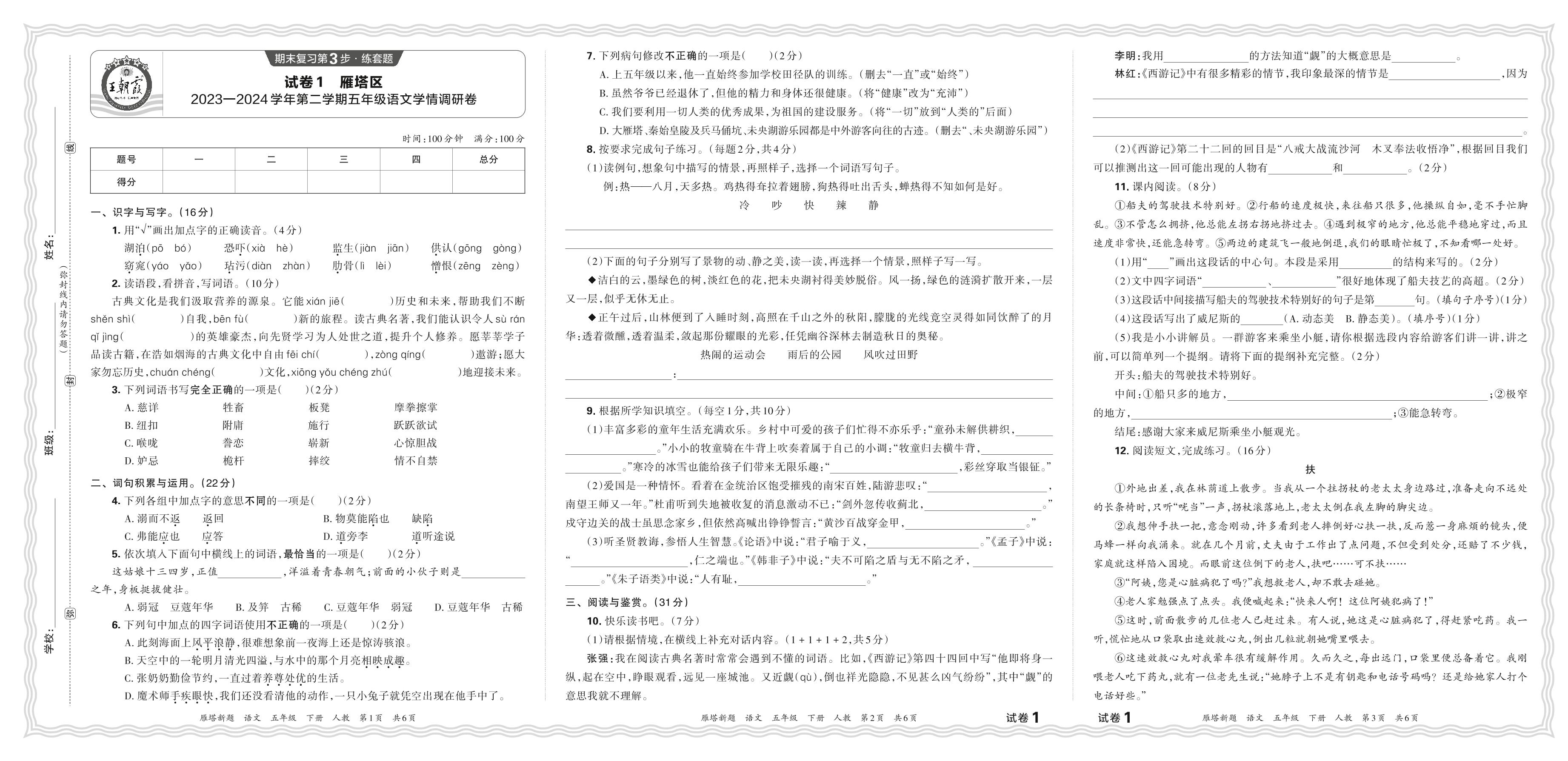 陕西省西安市雁塔区2023—2024学年第二学期五年级语文学情调研卷(人教版)【1】