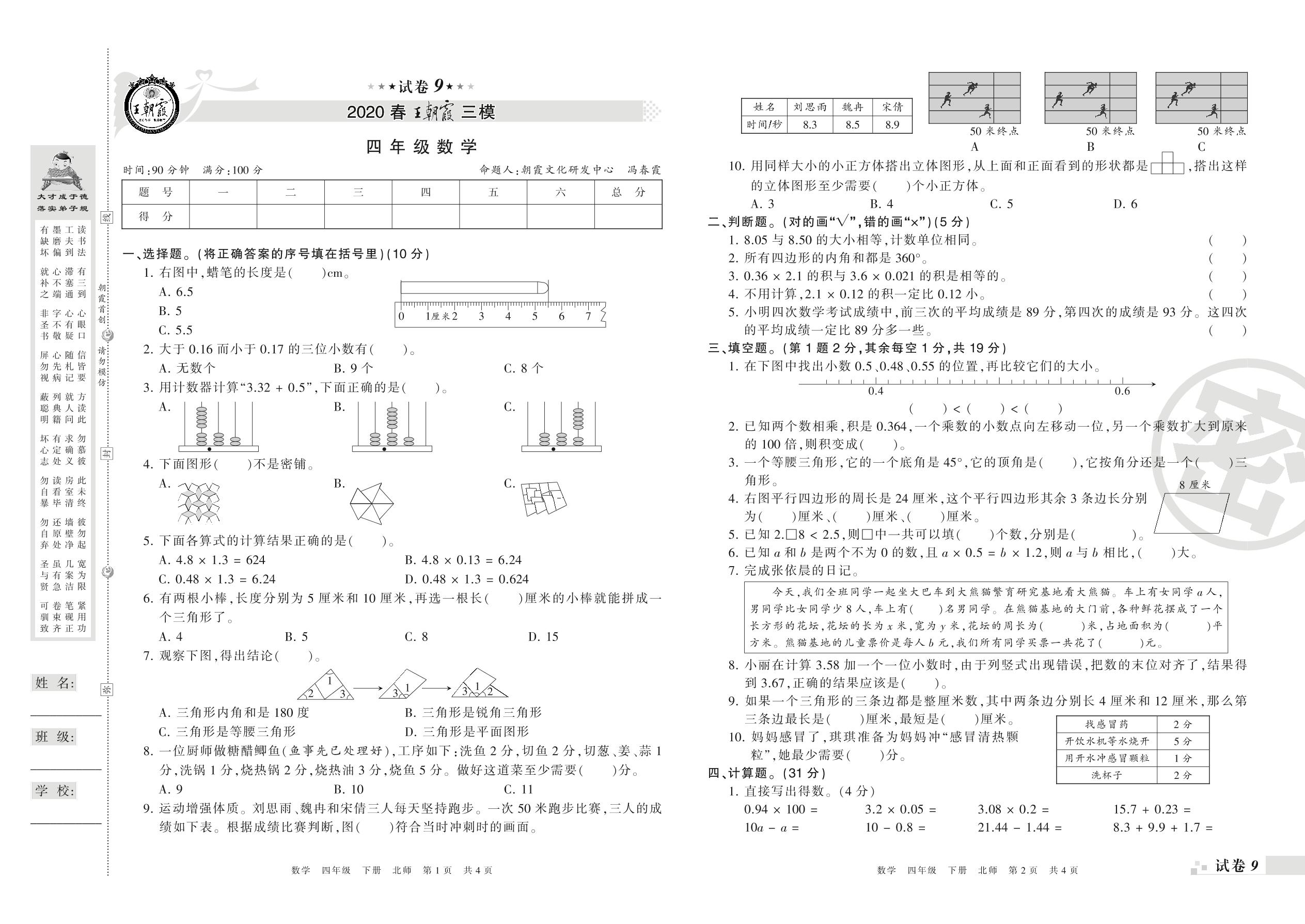 王朝霞期末模拟卷四年级下册数学(北师版)_R210804142518【9】