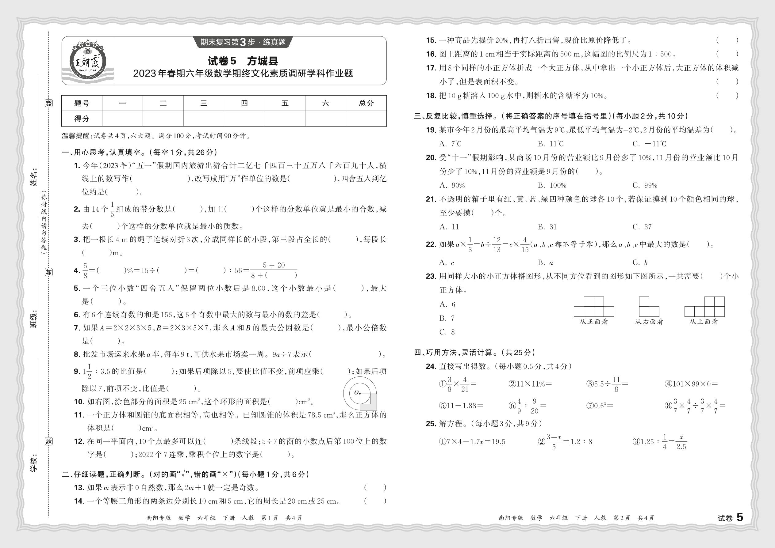 河南省南阳市方城县2023年春期六年级数学期终文化素质调研学科作业题(人教版)【5】