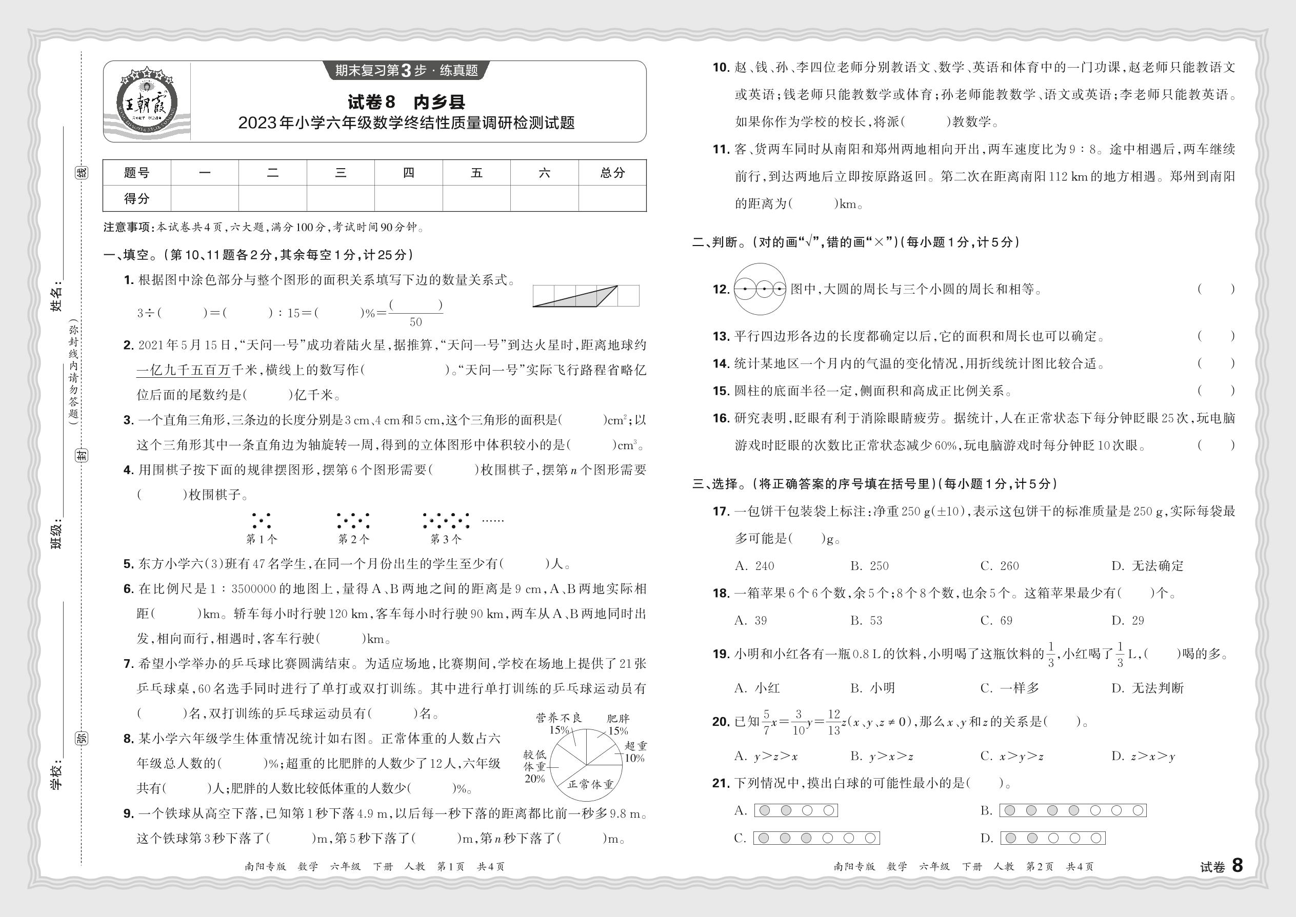 河南省南阳市内乡县2023年小学六年级数学终结性质量调研检测试题(人教版)【8】