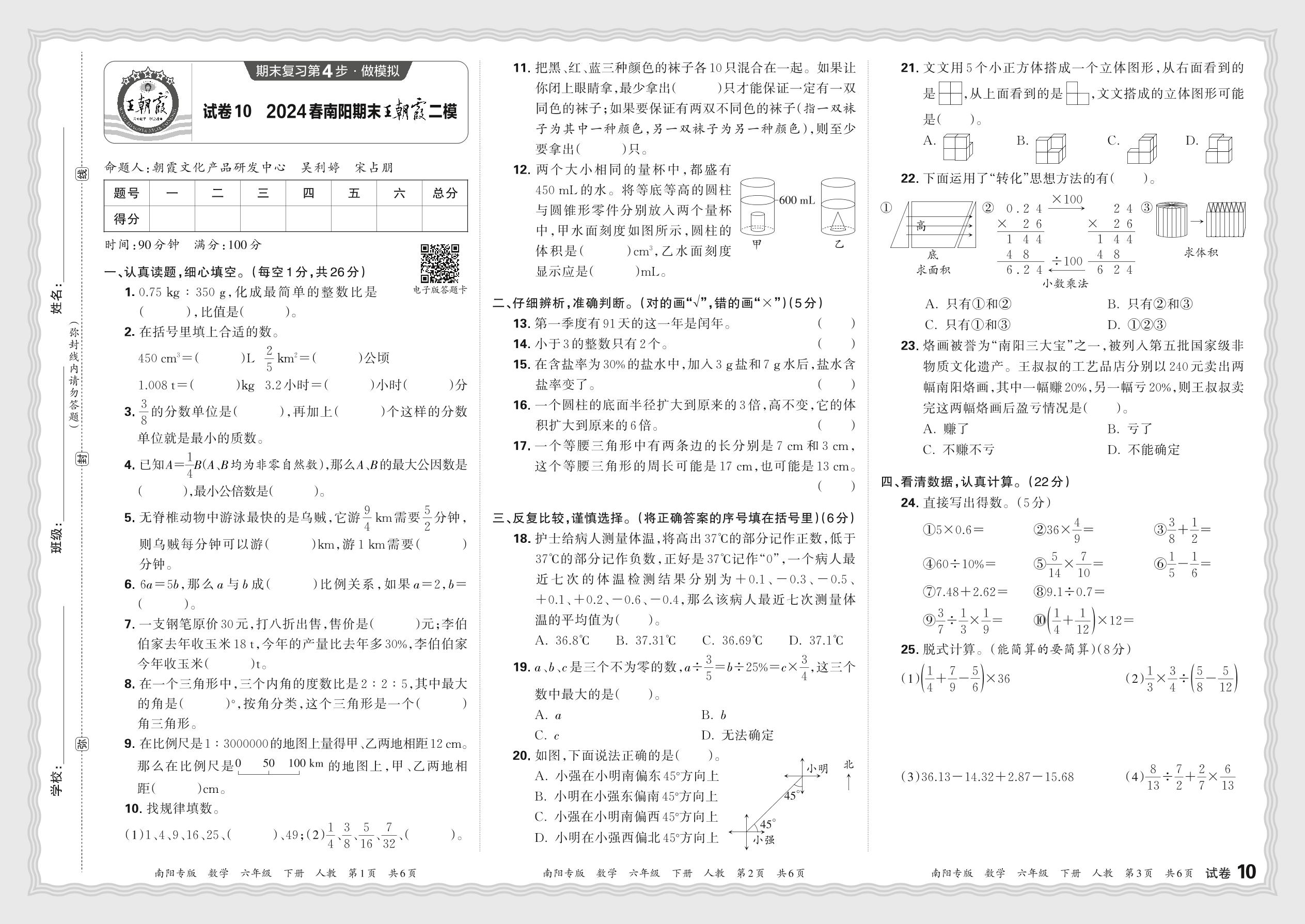 2024春下册六年级数学人教版 河南南阳期末王朝霞二模【10】