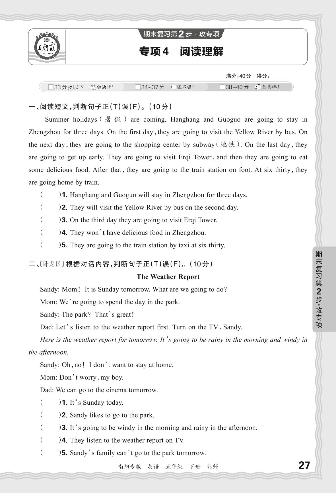 2024春下册五年级英语北师版 期末专项卷南阳版·阅读理解【4】