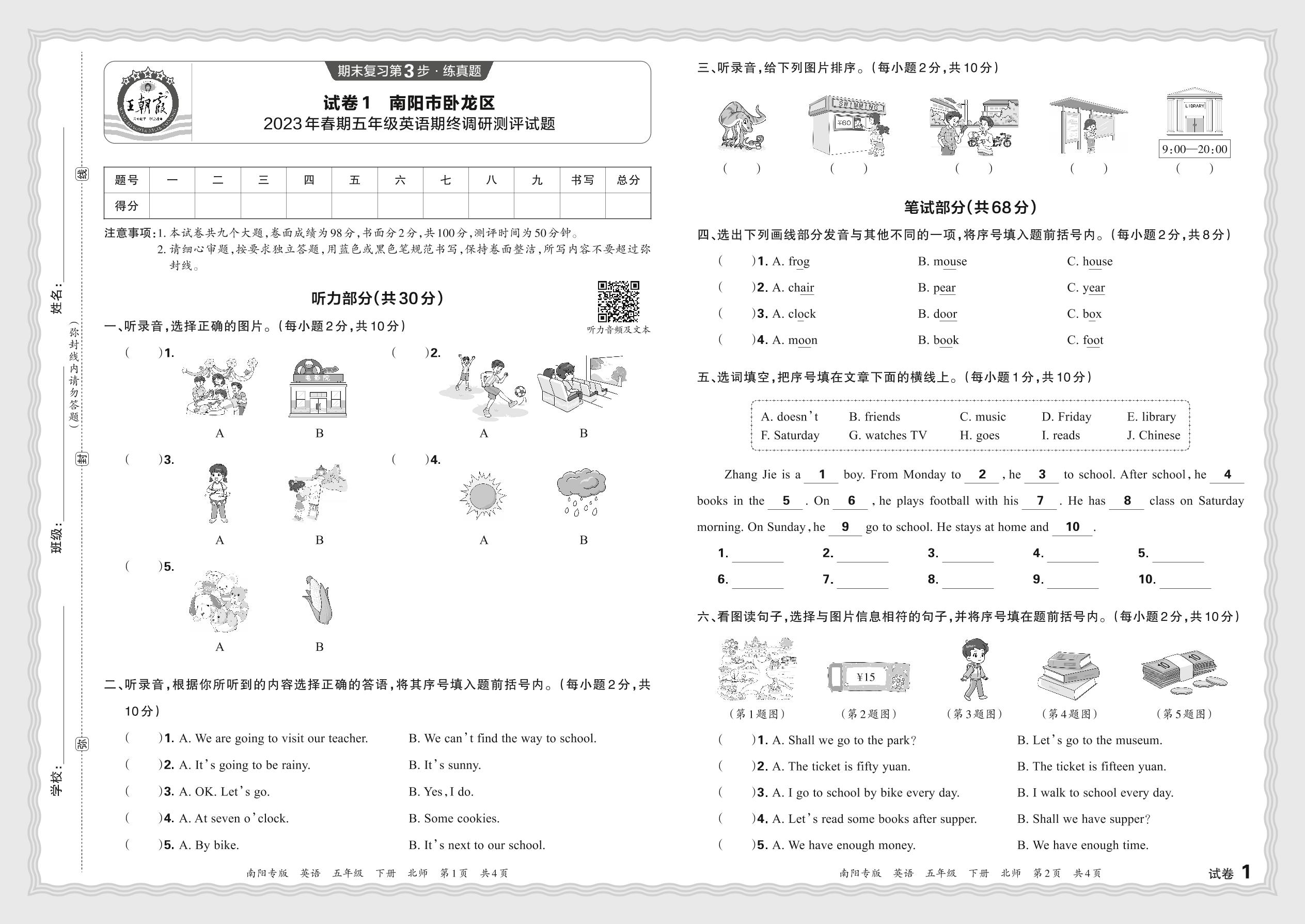 河南省南阳市卧龙区2023年春期五年级英语期终调研测评试题(北师版)【1】