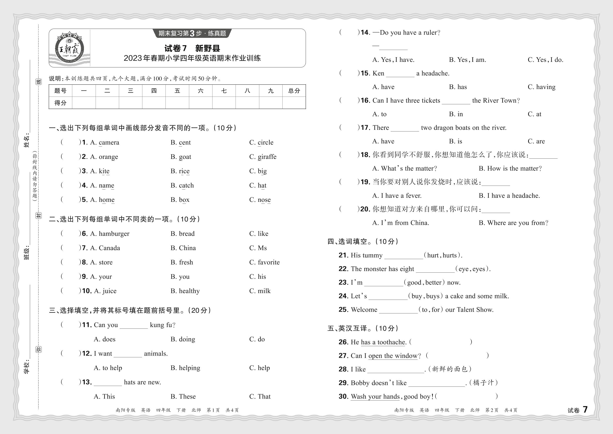 河南省南阳市新野县2023年春期小学四年级英语期末作业训练(北师版)【7】