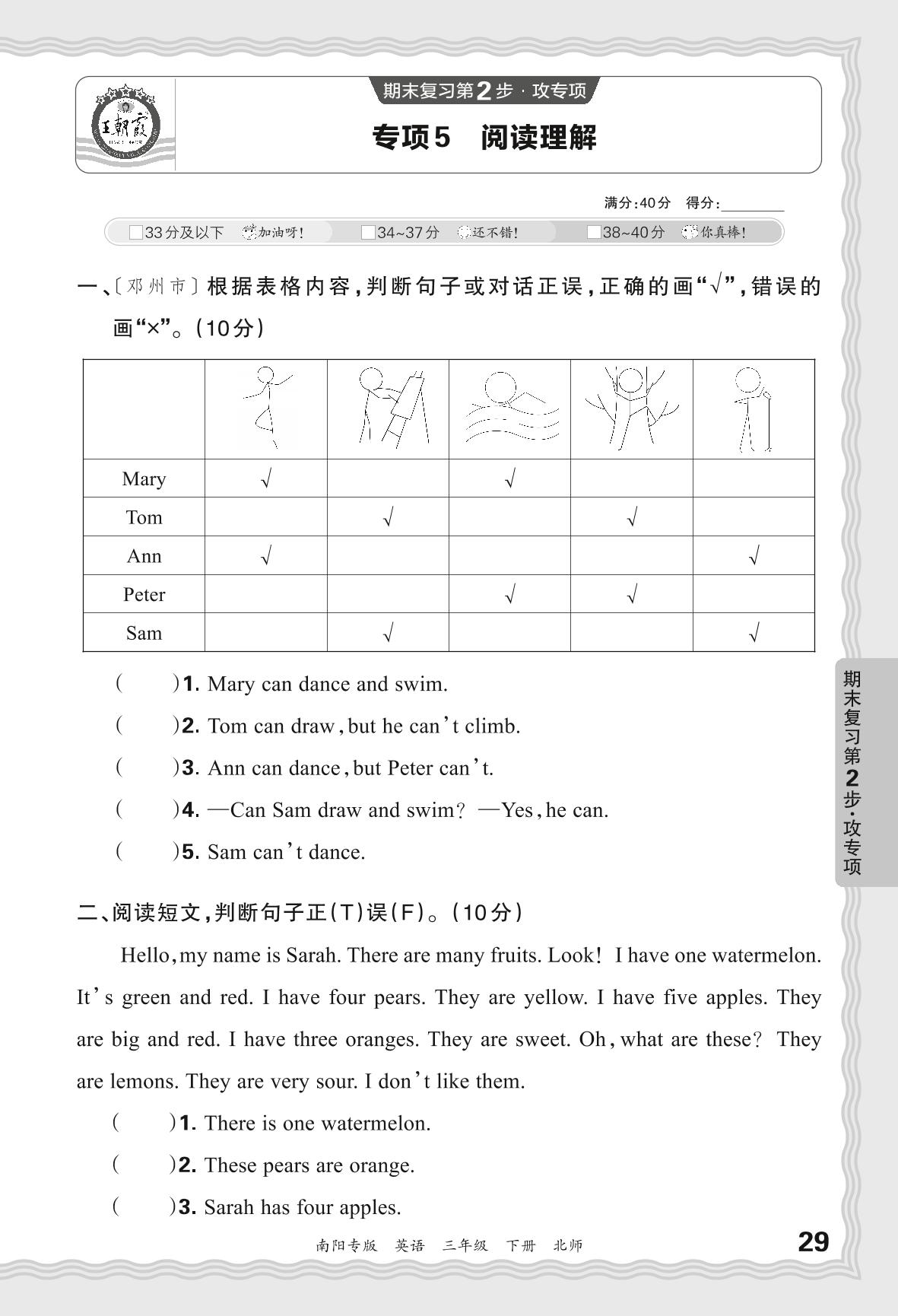 2024春下册三年级英语北师版 期末专项卷南阳版·阅读理解【5】