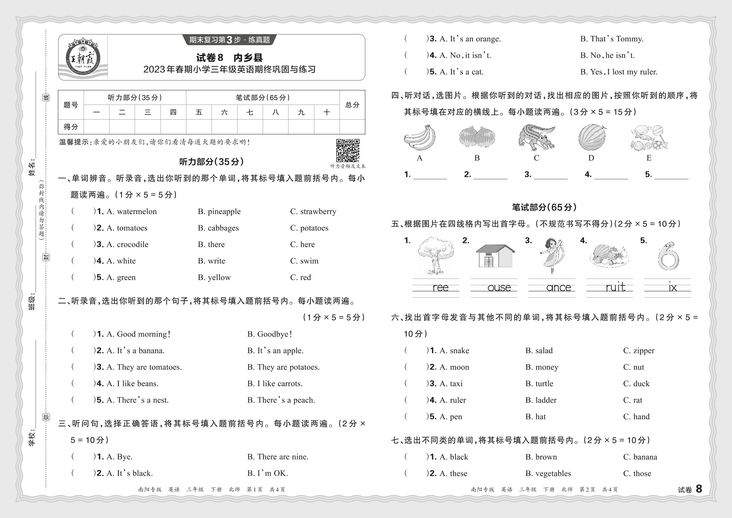 河南省南阳市内乡县2023年春期小学三年级英语期终巩固与练习(北师版)【8】