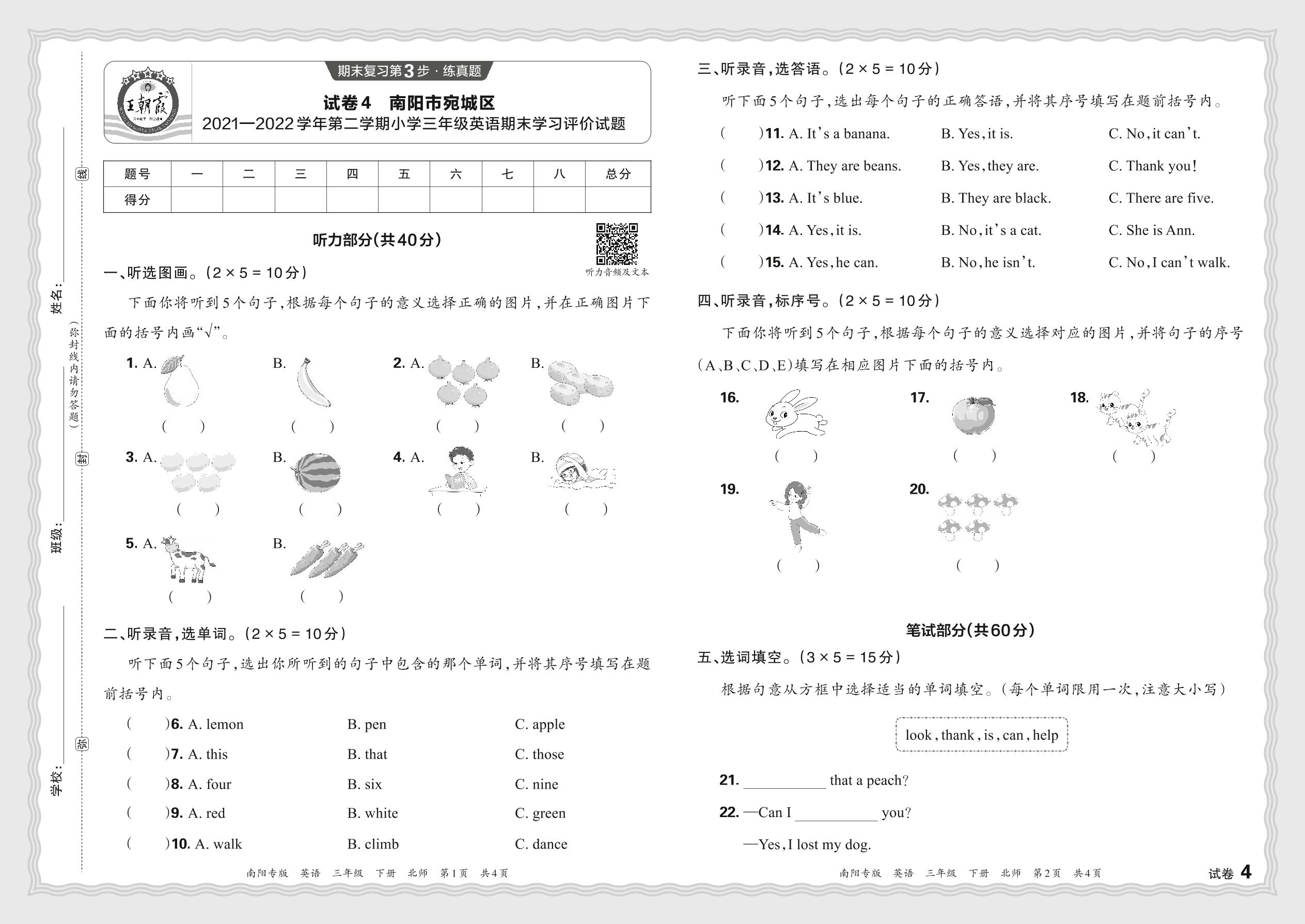 河南省南阳市宛城区2021-2022学年第二学期小学三年级英语期末学习评价试题(北师版)【4】
