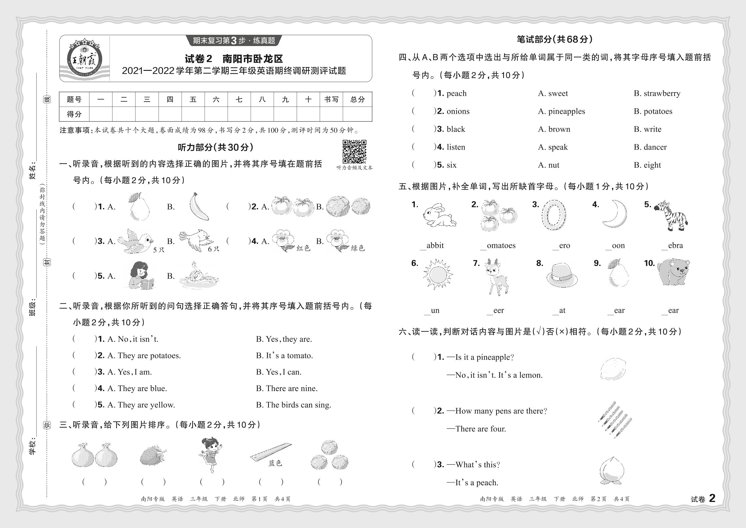 河南省南阳市卧龙区2021-2022学年第二学期三年级英语期终调研测评试题(北师版)【2】