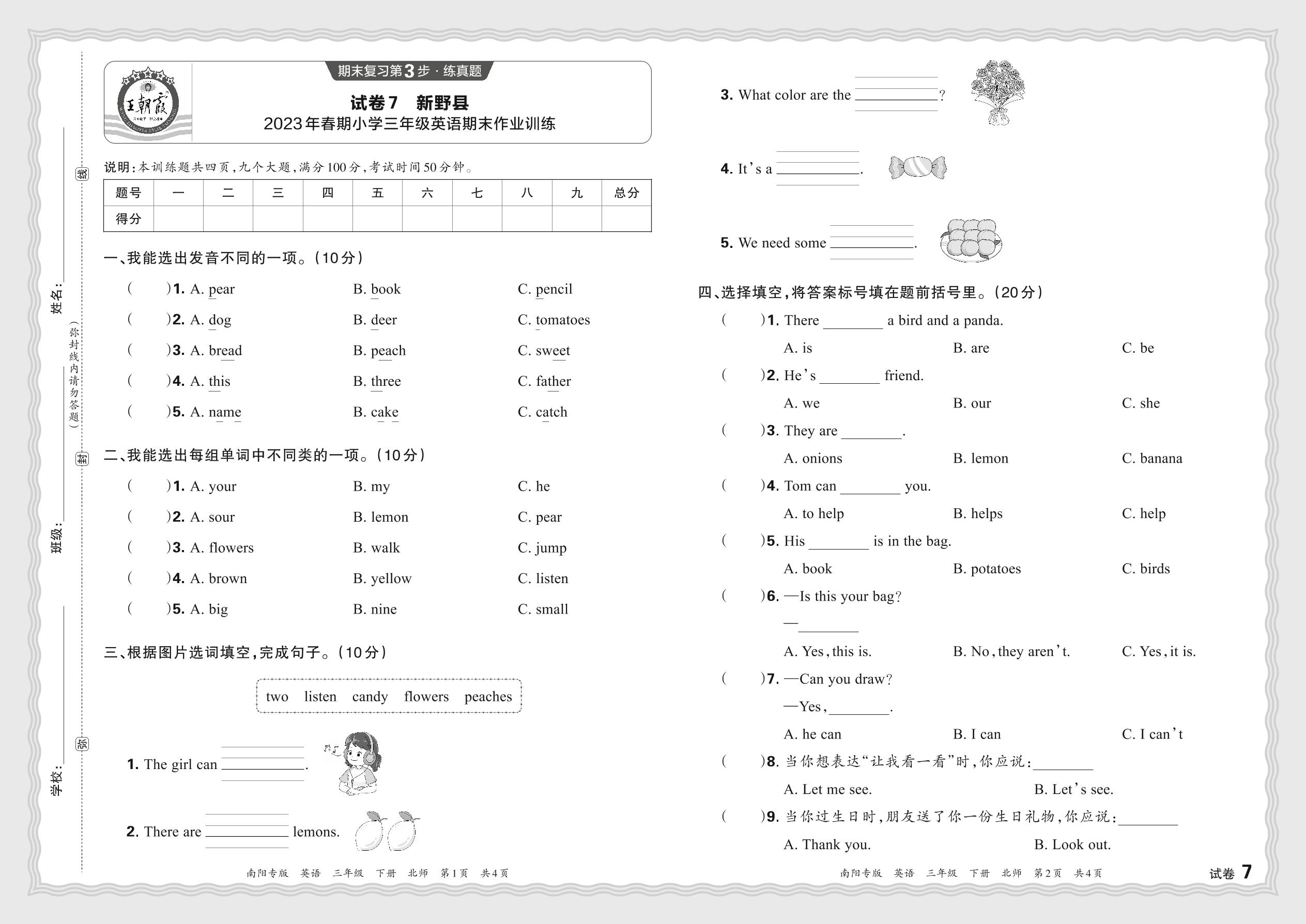 河南省南阳市新野县2023年春期小学三年级英语期末作业训练(北师版)【7】