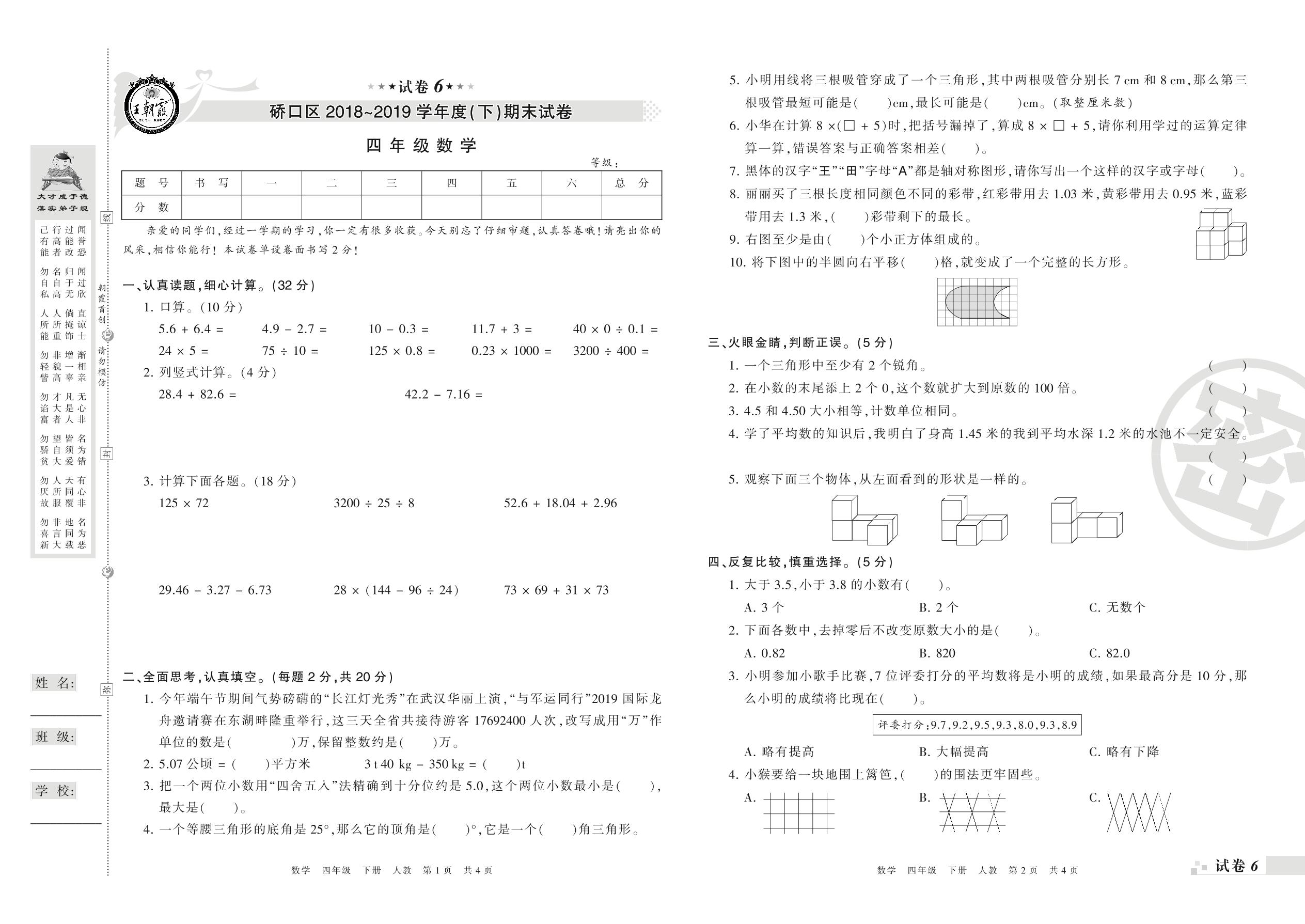 2018-2019学年第二学期武汉市硚口区四年级数学试卷(人教版)【6】