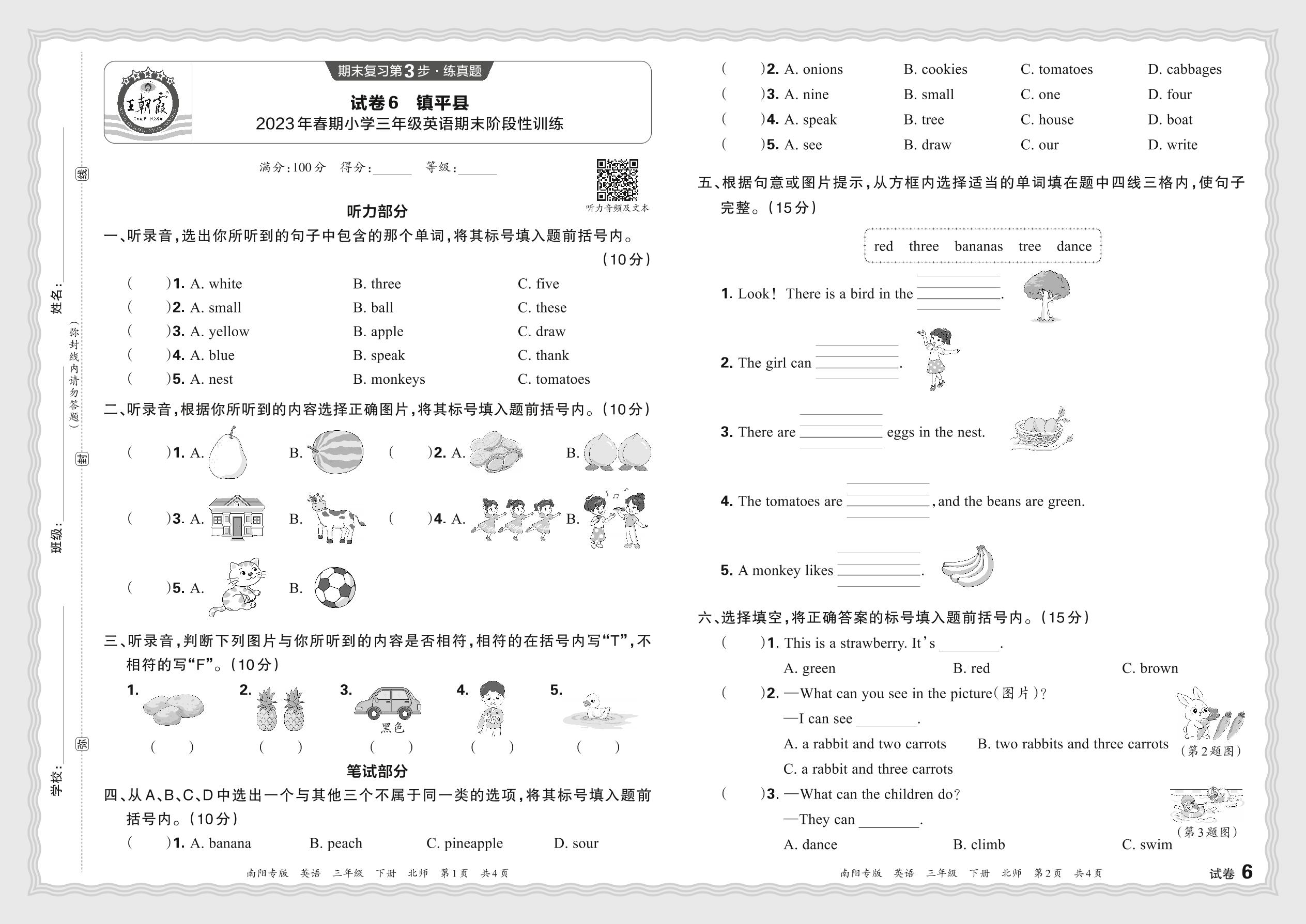 河南省南阳市镇平县2023年春期小学三年级英语期末阶段性训练(北师版)【6】