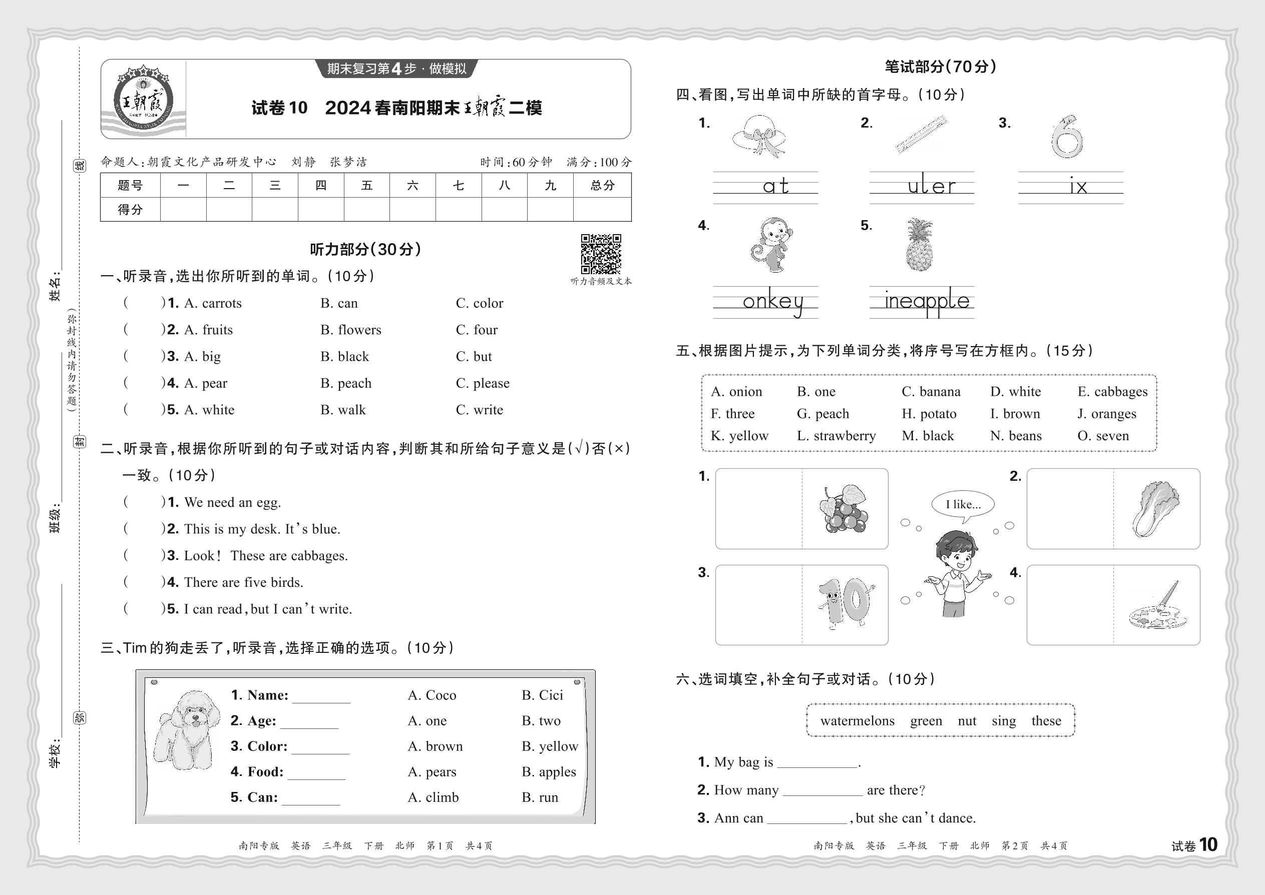 2024春下册三年级英语北师版 河南南阳期末王朝霞二模【10】