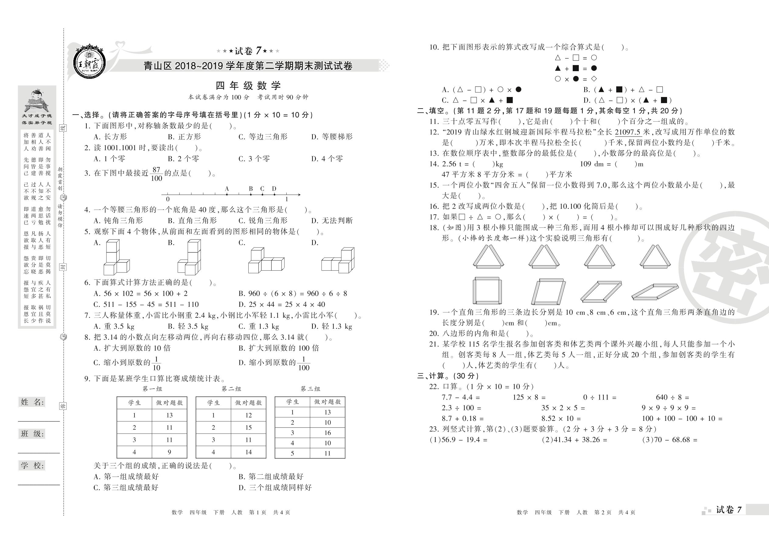 2018-2019学年第二学期武汉市青山区四年级数学试卷(人教版)【7】
